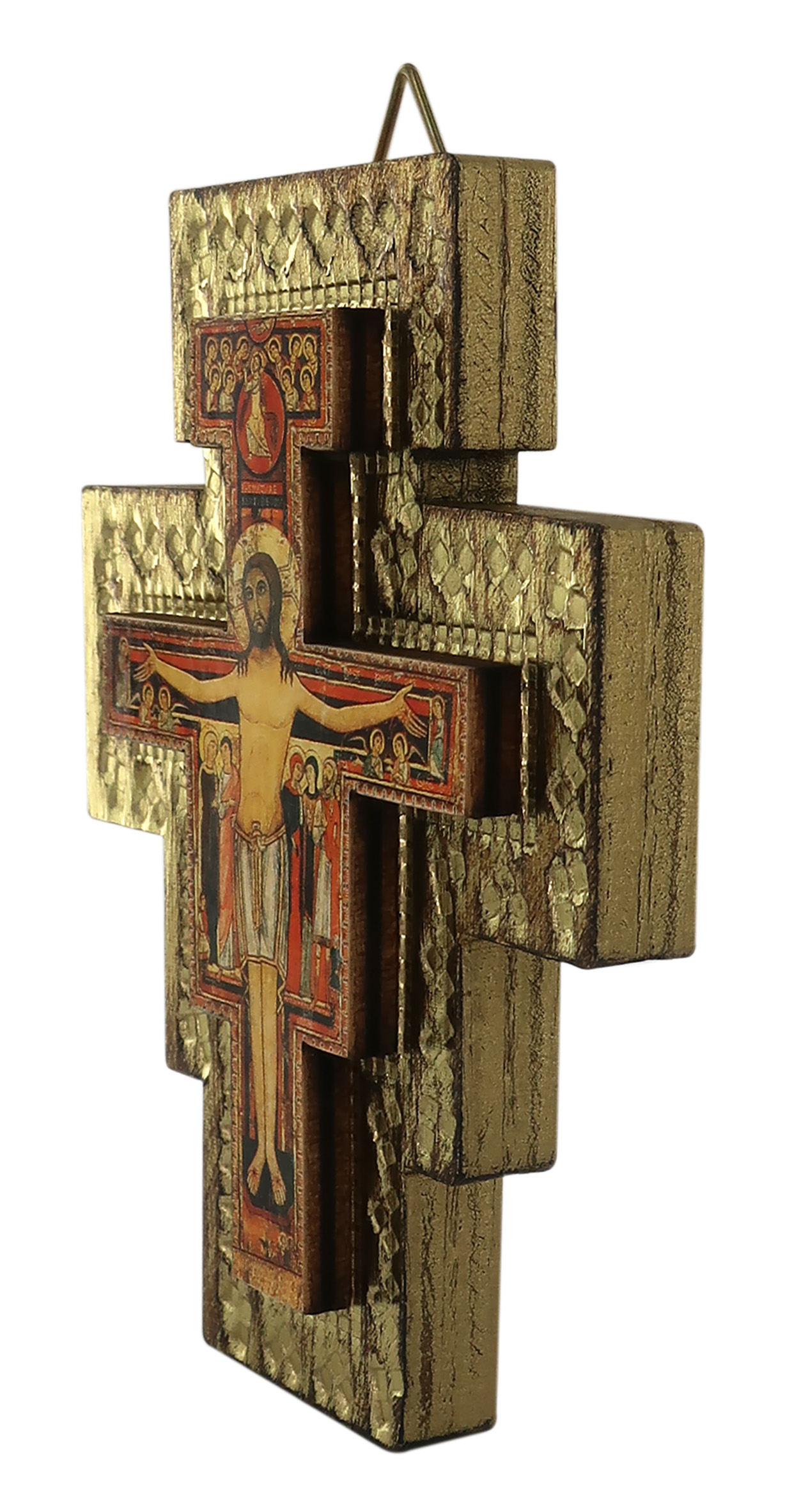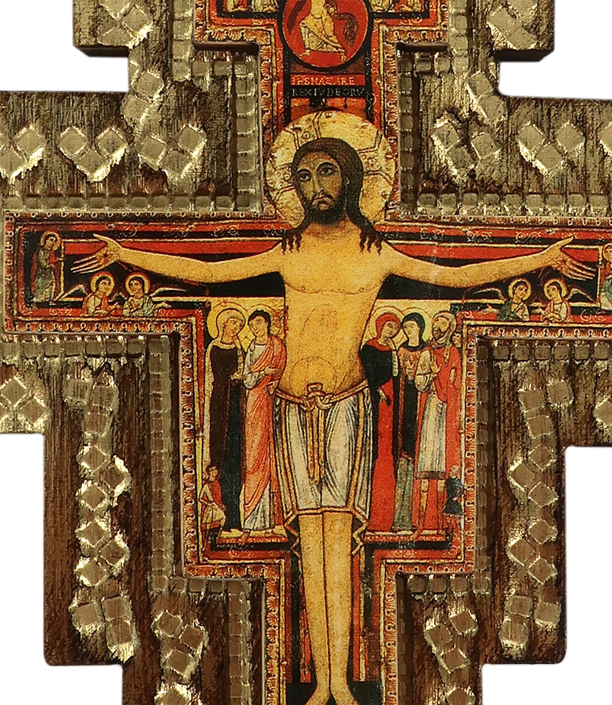 Questa croce in rilievo raffigura il Cristo apparso a San Francesco nella chiesa di San Damiano ad Assisi. Stampata su carta ed applicata su legno di pioppo con rilievo. L'immagine del crocifisso ha i bordi dei personaggi contornati color oro. Ideata per essere appesa alla parete.
