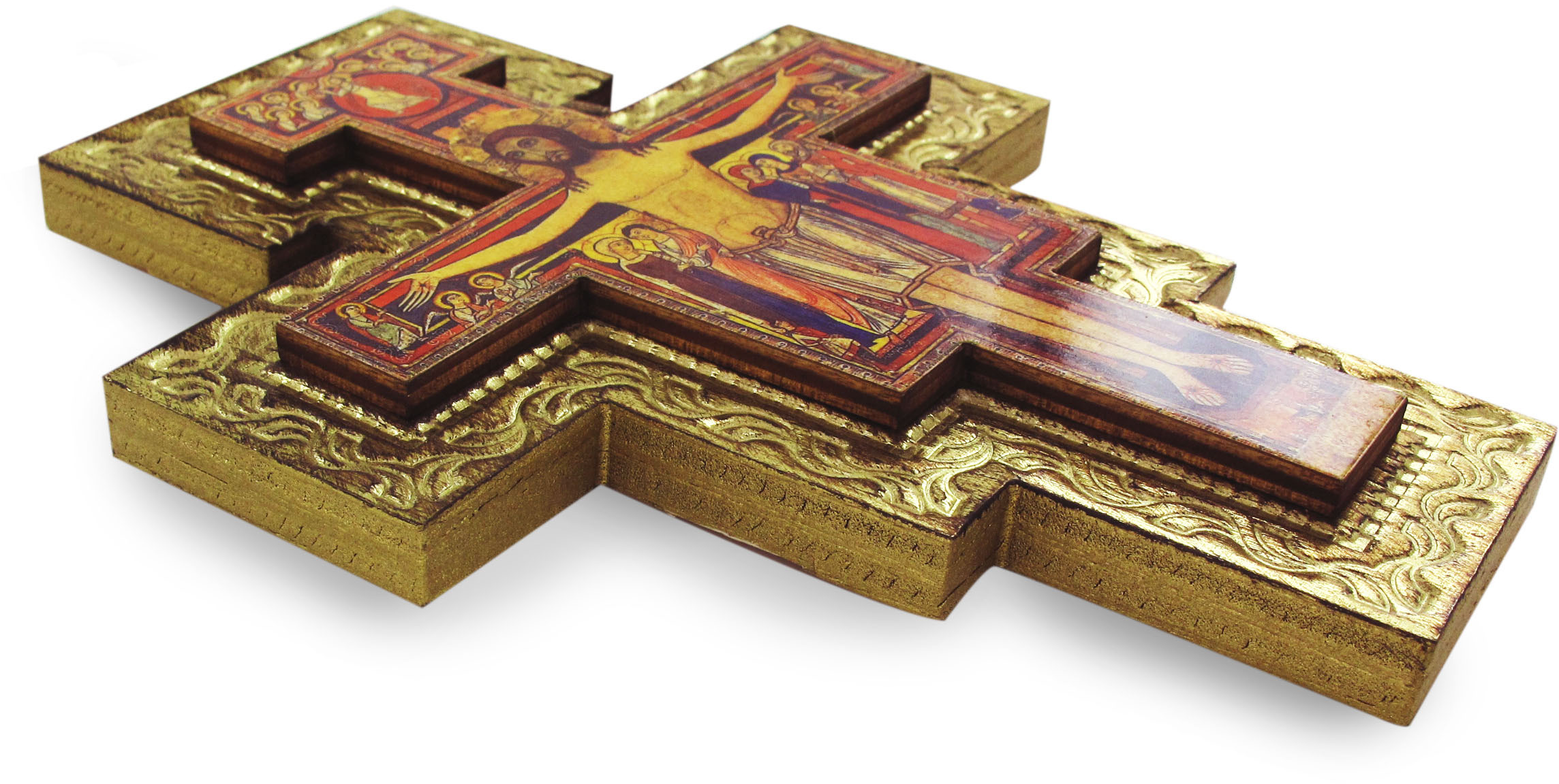 Questa croce in rilievo raffigura il Cristo apparso a San Francesco nella chiesa di San Damiano ad Assisi. Stampata su carta ed applicata su legno di pioppo con rilievo. L'immagine del crocifisso ha i bordi dei personaggi contornati color oro. Ideata per essere appesa alla parete.