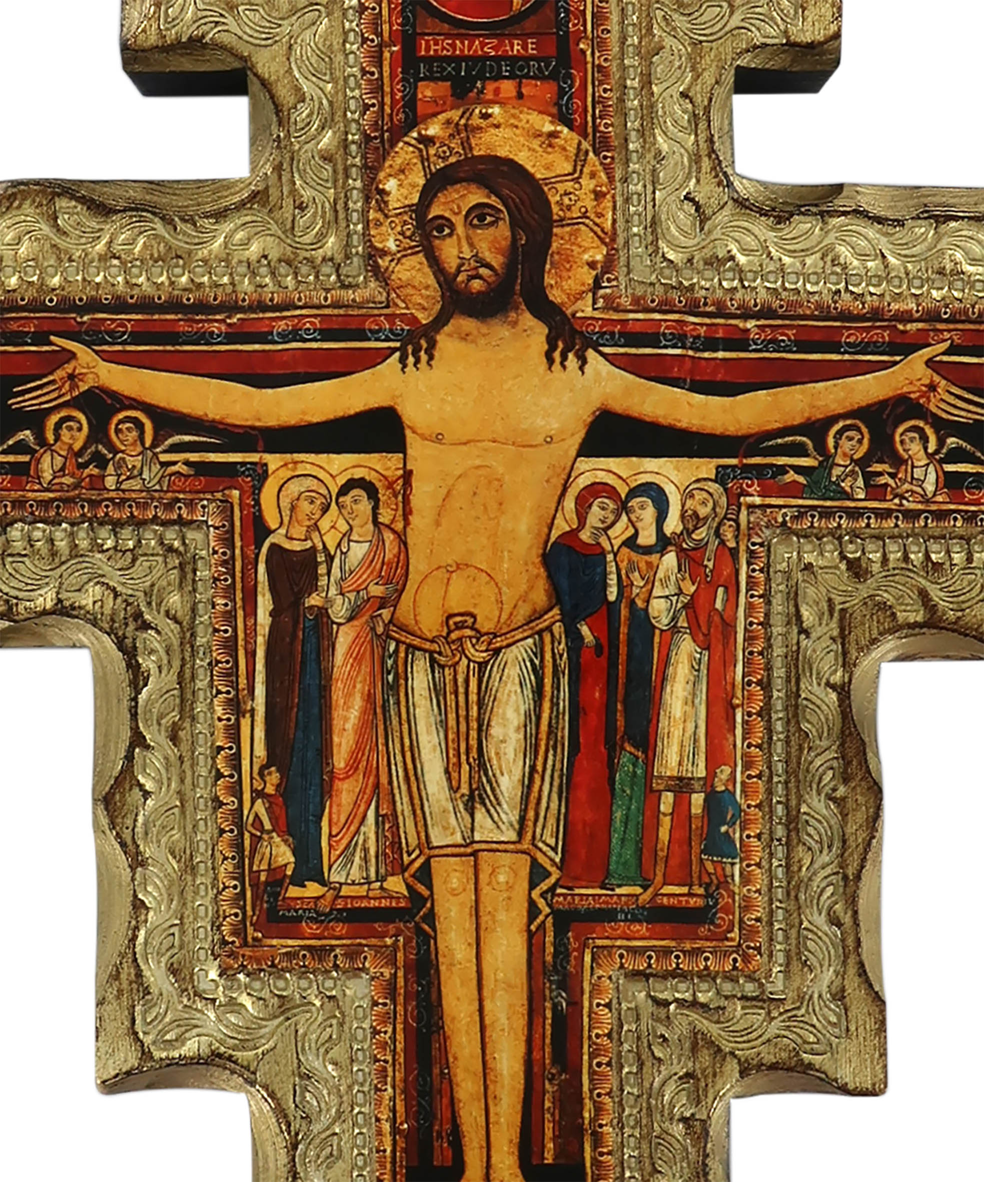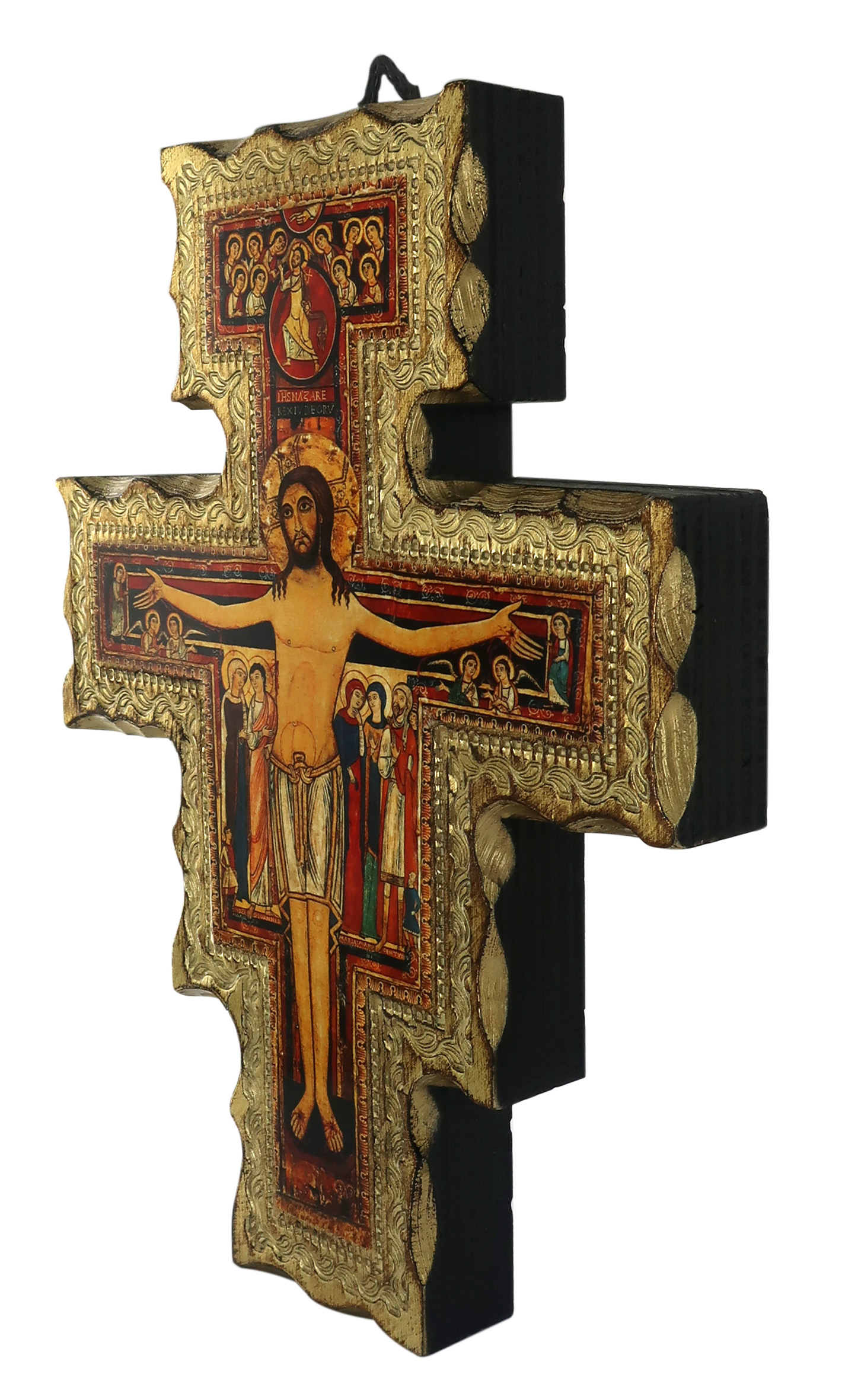 La croce rappresenta il Cristo apparso a San Francesco nella chiesa di San Damiano ad Assisi. L'immagine è una stampa aplicata su legno di pioppo dello spessore di 3 cm ed ha un bordo dorato.