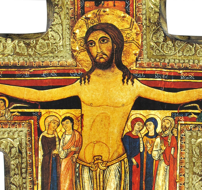 La croce rappresenta il Cristo apparso a San Francesco nella chiesa di San Damiano ad Assisi. L'immagine è una stampa aplicata su legno di pioppo dello spessore di 3 cm ed ha un bordo dorato.