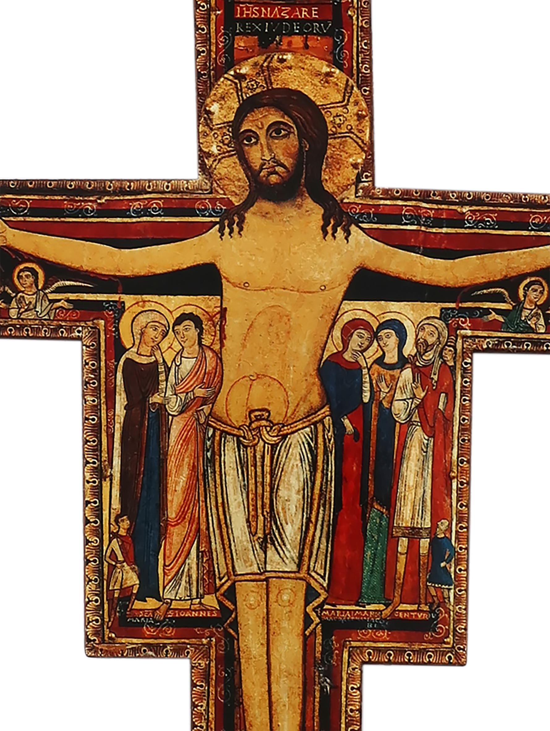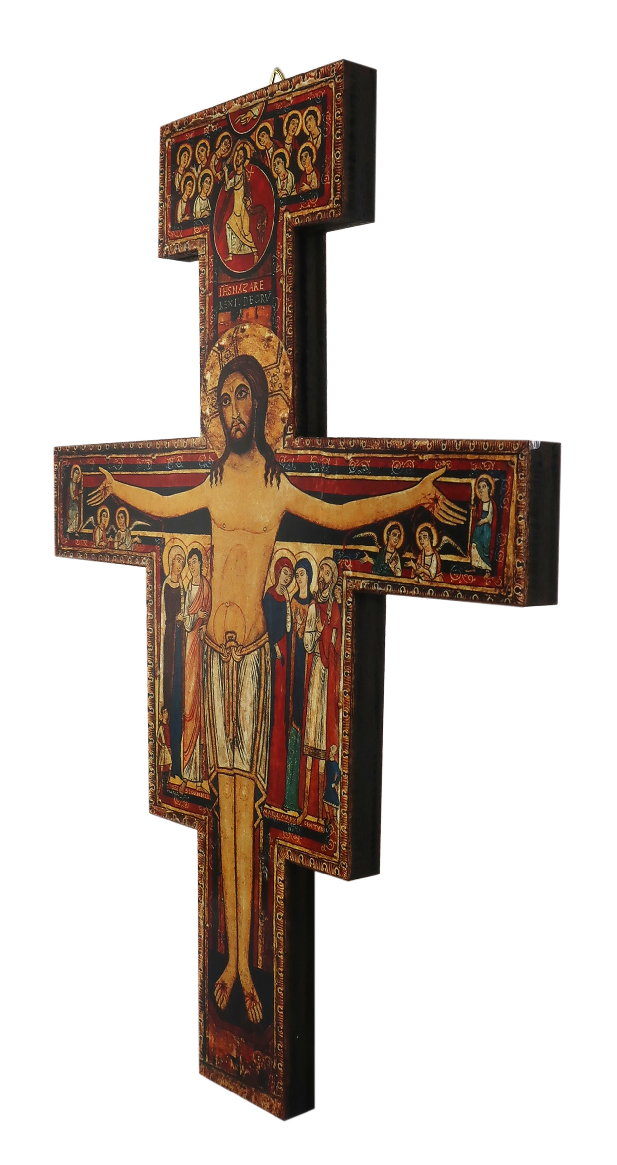La croce rappresenta il Cristo apparso a San Francesco nella chiesa di San Damiano ad Assisi, stampato su carta applicata su legno di betulla dello spessore di cm 1.