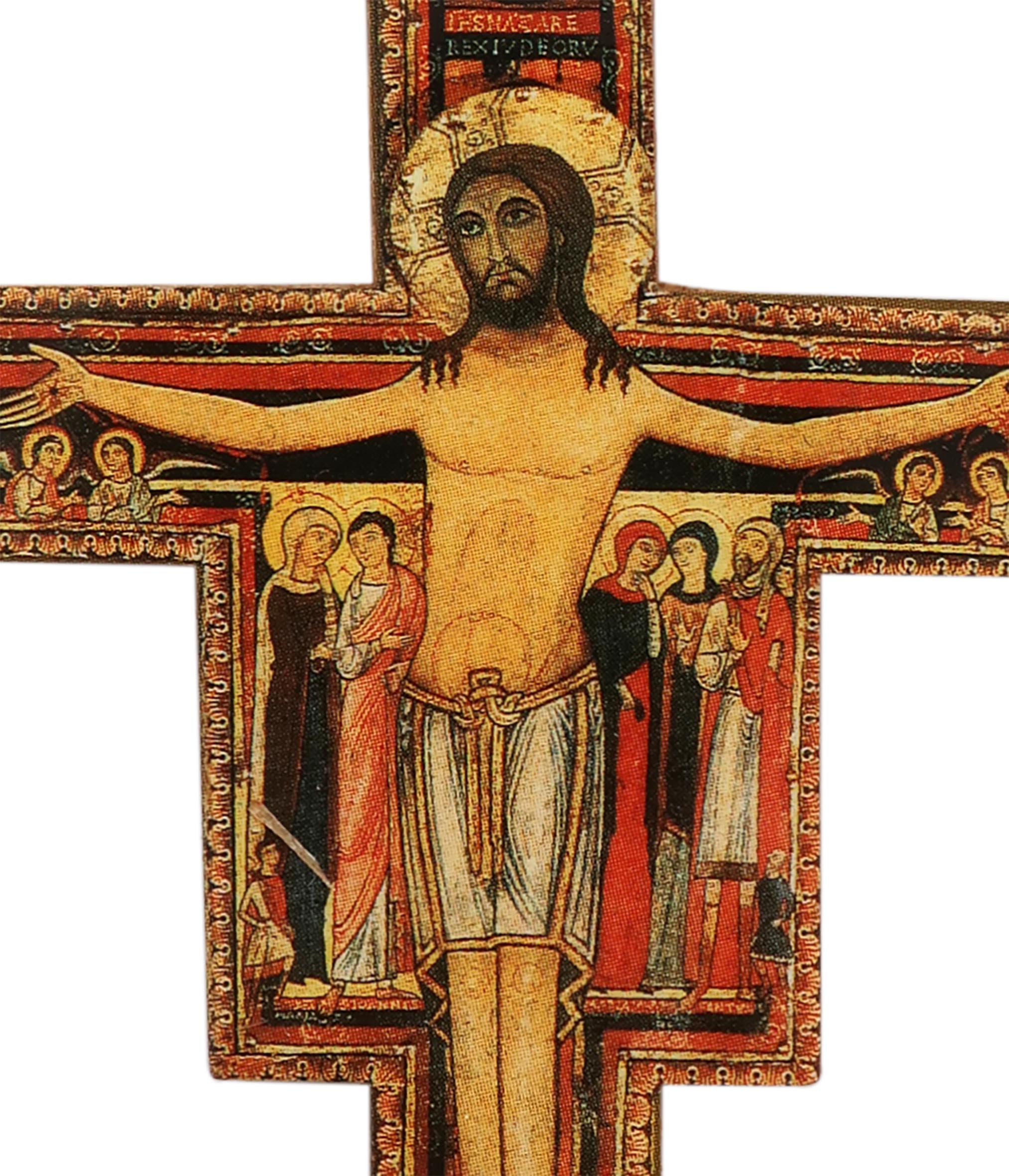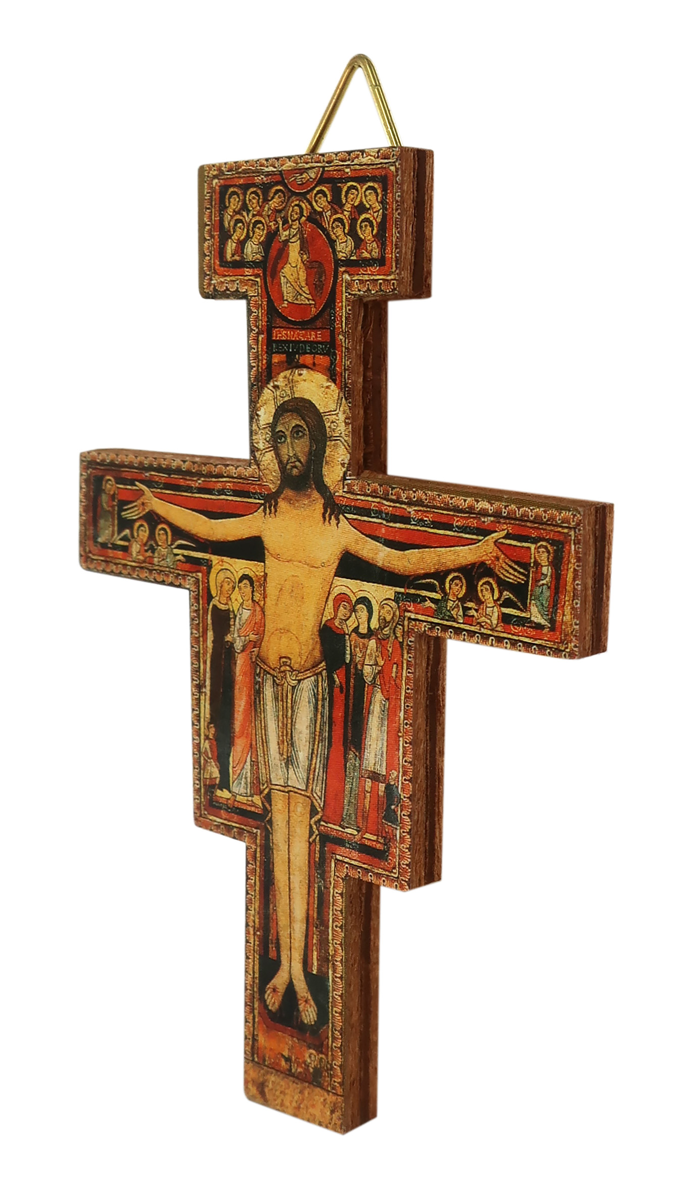 La croce rappresenta il Cristo apparso a San Francesco nella chiesa di San Damiano ad Assisi, stampato su carta applicata su legno di betulla dello spessore di cm 3.