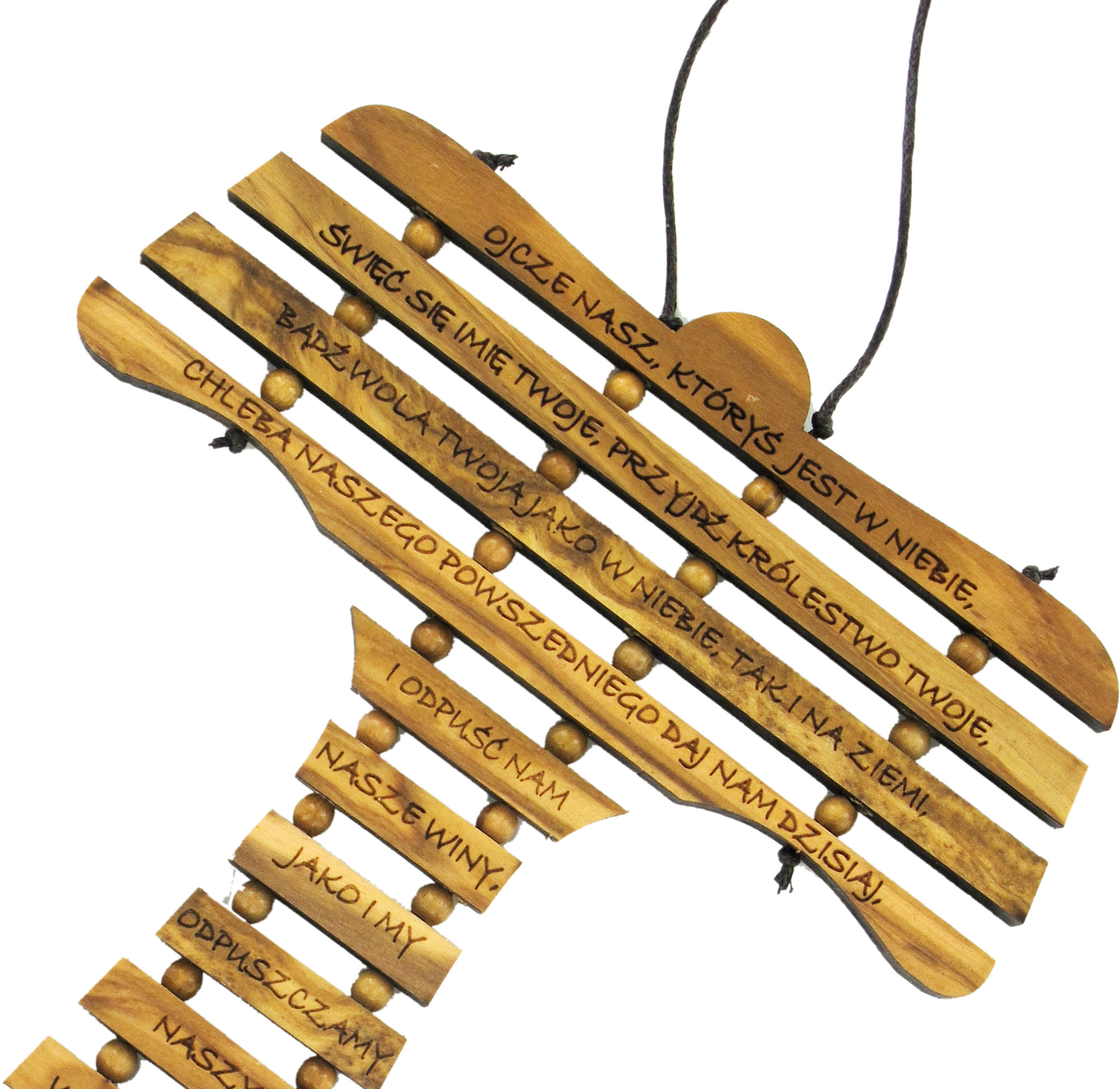 Croce Tau in ulivo con preghiera Padre Nostro in POLACCO. La croce da muro è alta 19 cm. Dispone di comodo spago marrone all'estremità (lunghezza; 4,5 cm circa), che consente di appenderla al muro.