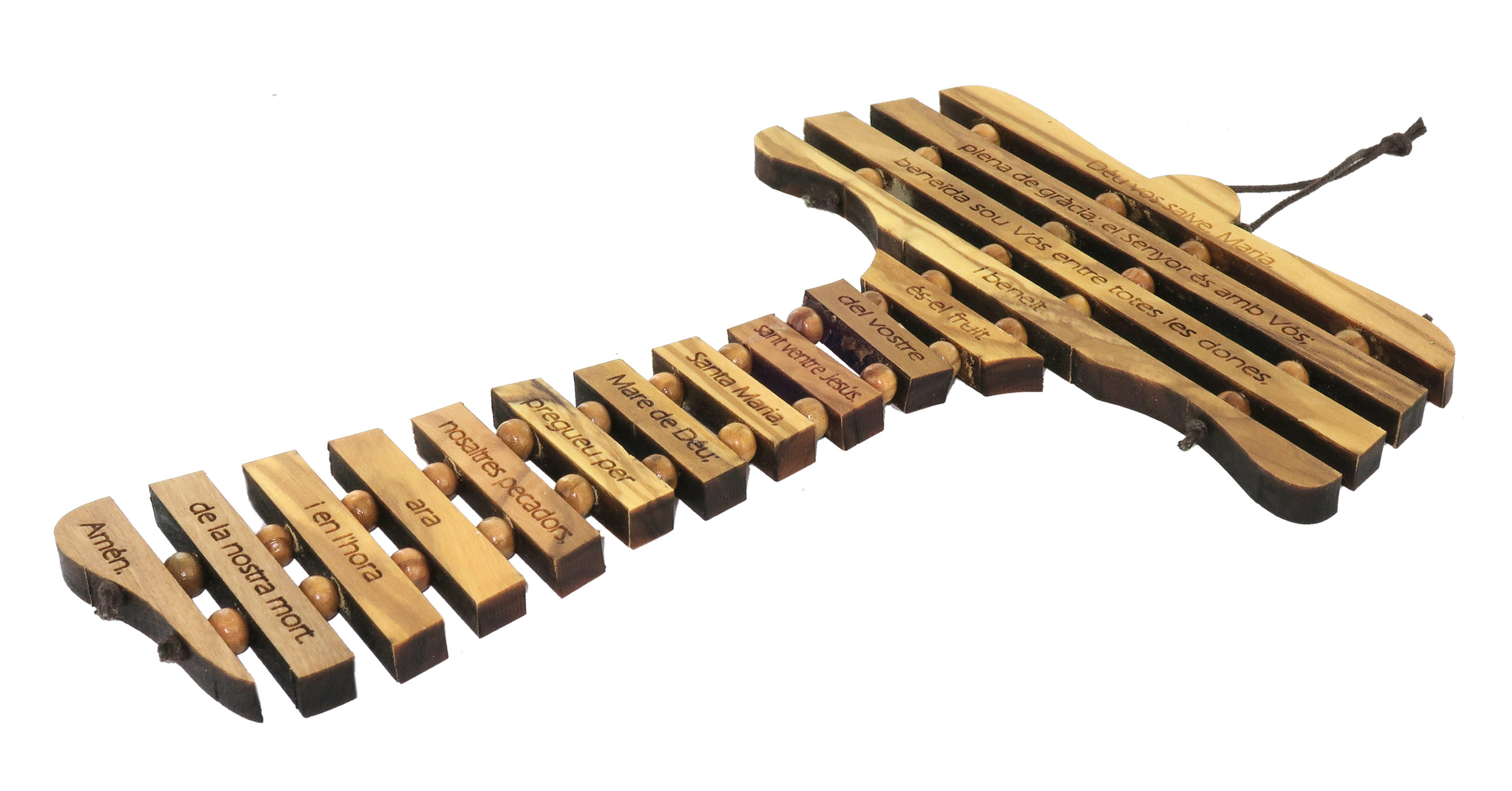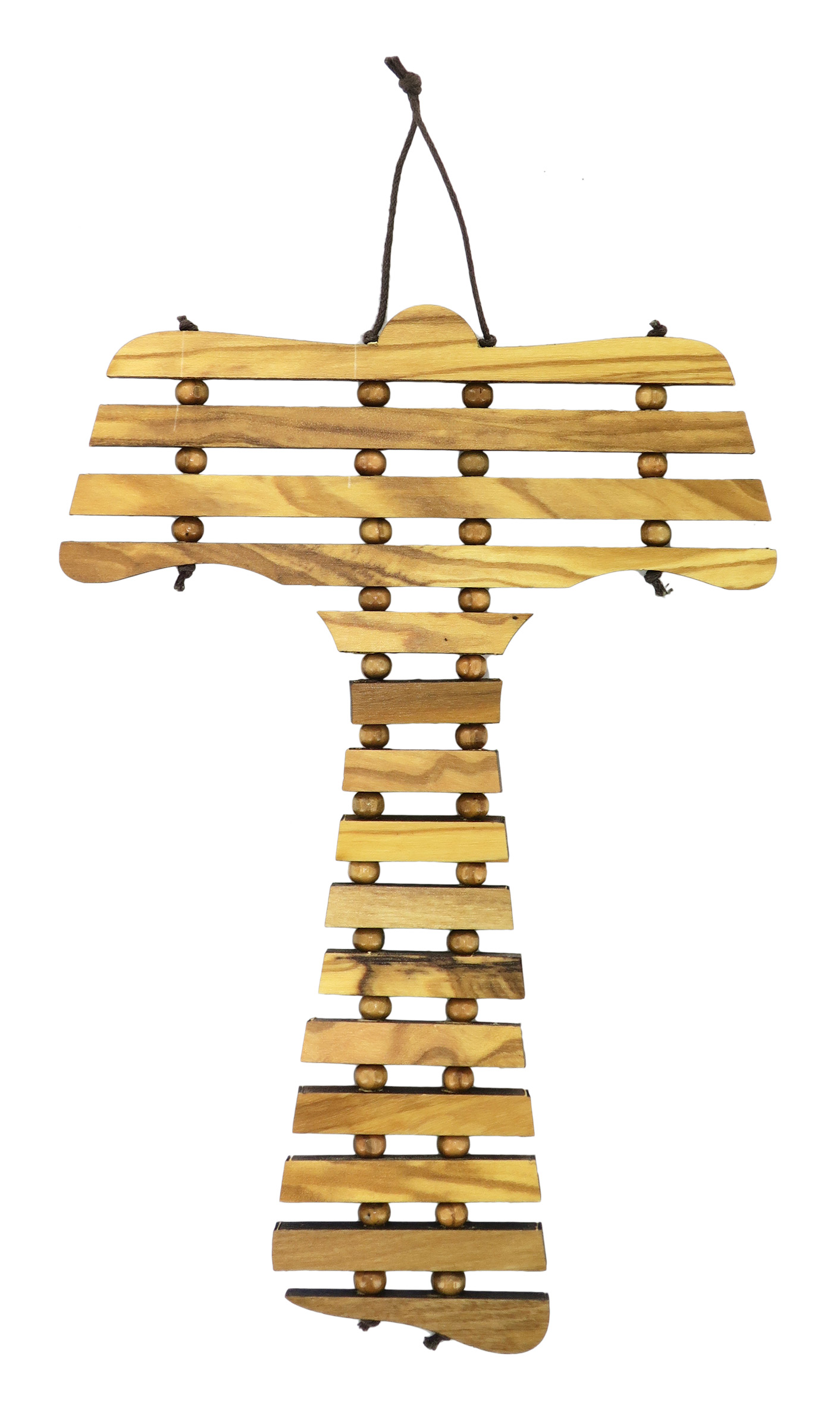 Croce Tau in ulivo con preghiera dell'Ave Maria in catalano, da 17 cm. La croce puo essere appesa alla parete. Il Tau è il segno concreto di una devozione cristiana, ma soprattutto un impegno di vita nella sequela del Cristo povero e crocifisso. Oggi, è generalmente considerata come simbolo degli ordini francescani e della redenzione.