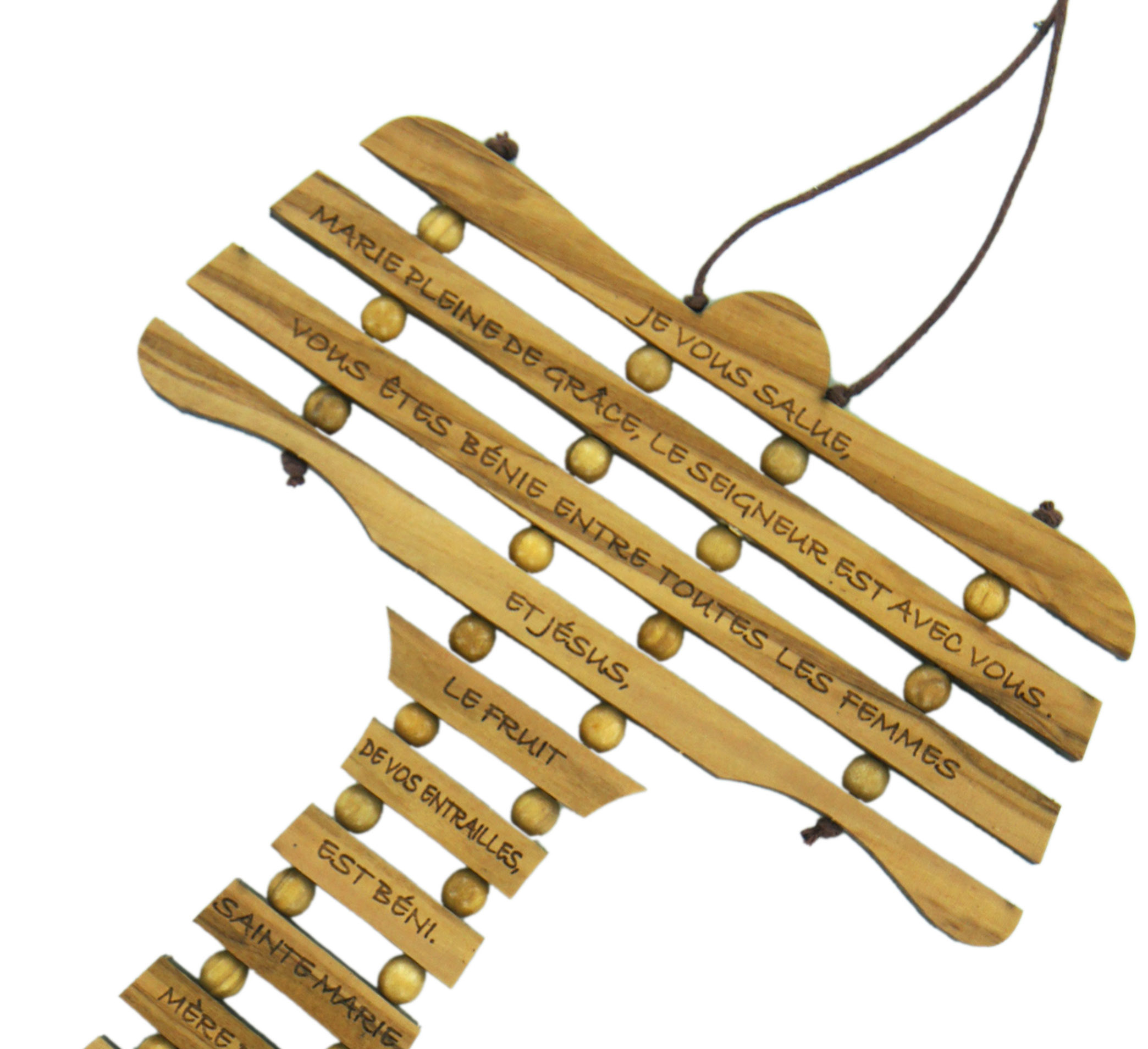 Croce Tau in ulivo con preghiera dell'Ave Maria in francese, da 17 cm. La croce puo essere appesa alla parete. Il Tau è il segno concreto di una devozione cristiana, ma soprattutto un impegno di vita nella sequela del Cristo povero e crocifisso. Oggi, è generalmente considerata come simbolo degli ordini francescani e della redenzione.