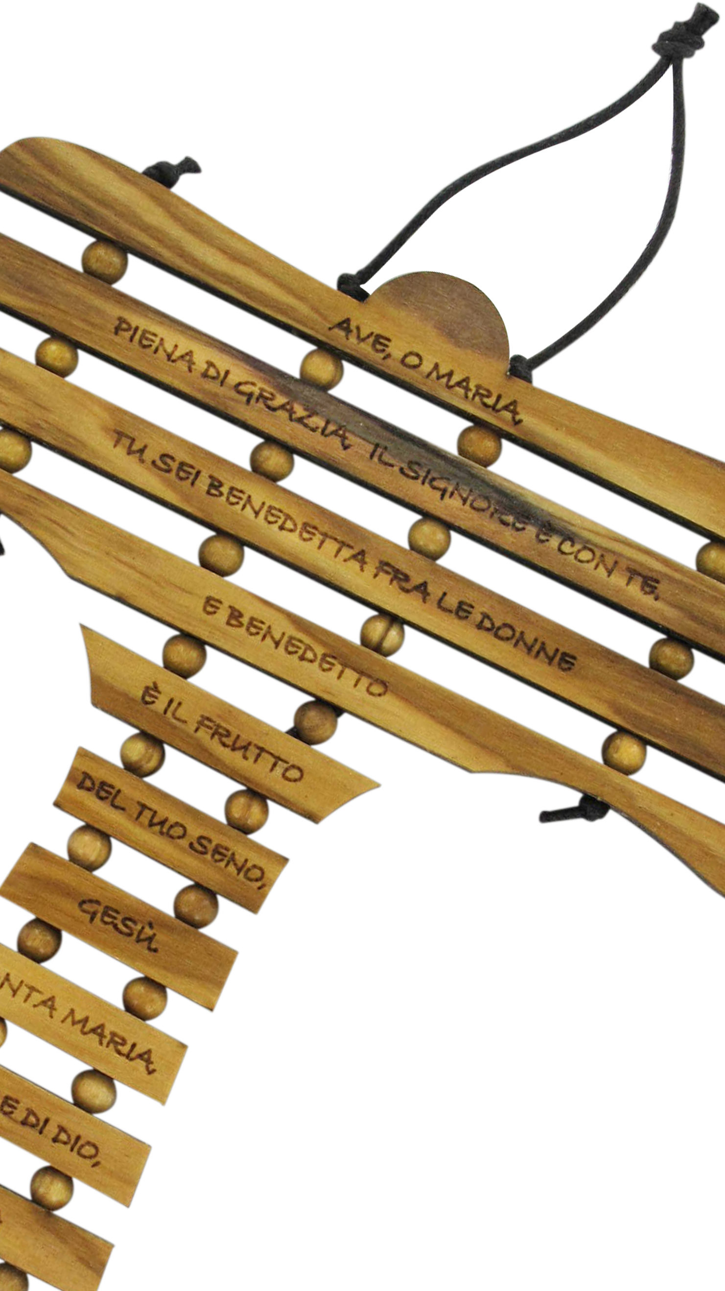 Croce Tau in ulivo con preghiera dell'Ave Maria in italiano, da 17 cm. La croce puo essere appesa alla parete. Il Tau è il segno concreto di una devozione cristiana, ma soprattutto un impegno di vita nella sequela del Cristo povero e crocifisso. Oggi, è generalmente considerata come simbolo degli ordini francescani e della redenzione.