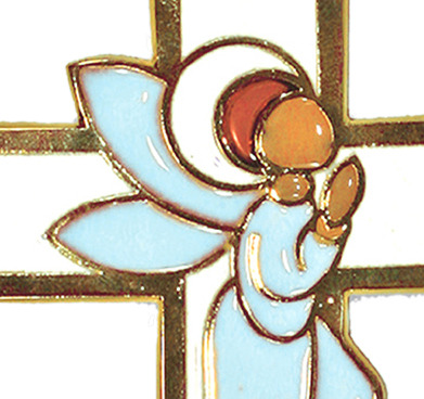 Originale croce realizzata in metallo con un angelo pregante in smalto azzurro.