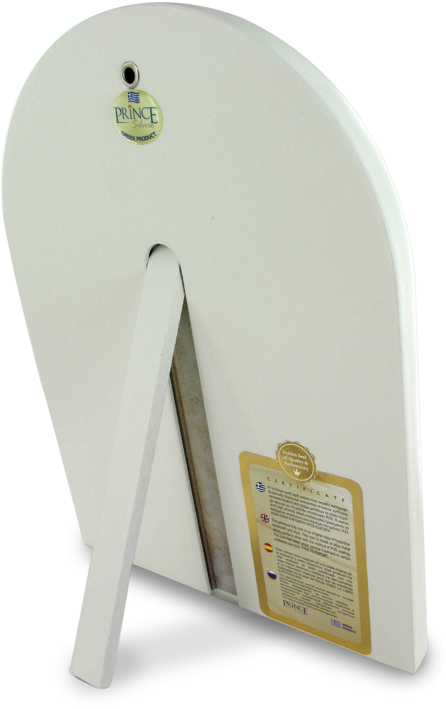 L'icona è inserita in un quadro ad arco di legno color bianco. Il quadro può essere sia appeso che appoggiato grazie al foro sul retro e ad un piedino d'appoggio presente all'interno della confezione.