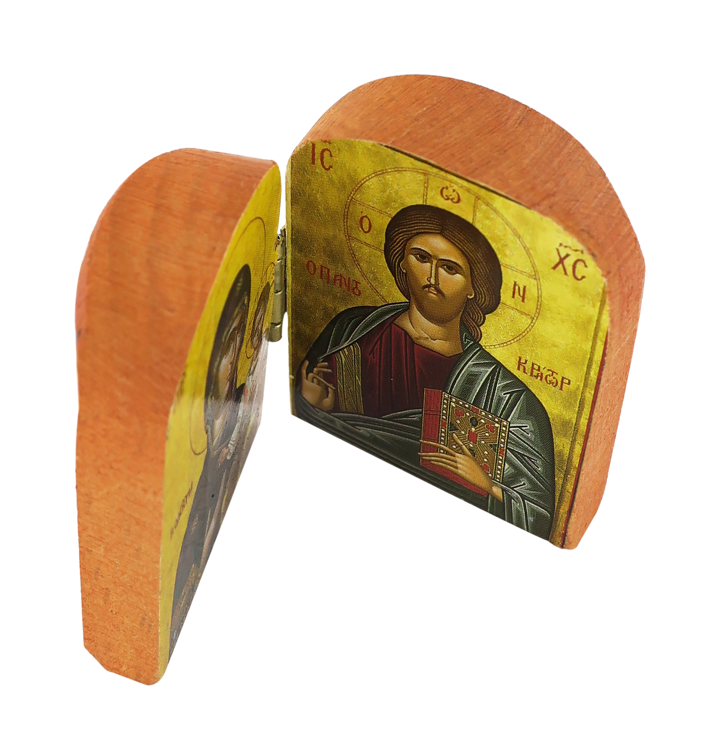 Dittico stile icona, Cristo Pantocratore e Madonna con bambino, Icona in Stile Arte Bizantina, Icona su Legno Rifinita con Aureole, Scritte e Bordure Fatte a Mano, Produzione Greca - 7 x 4,5 Cm
