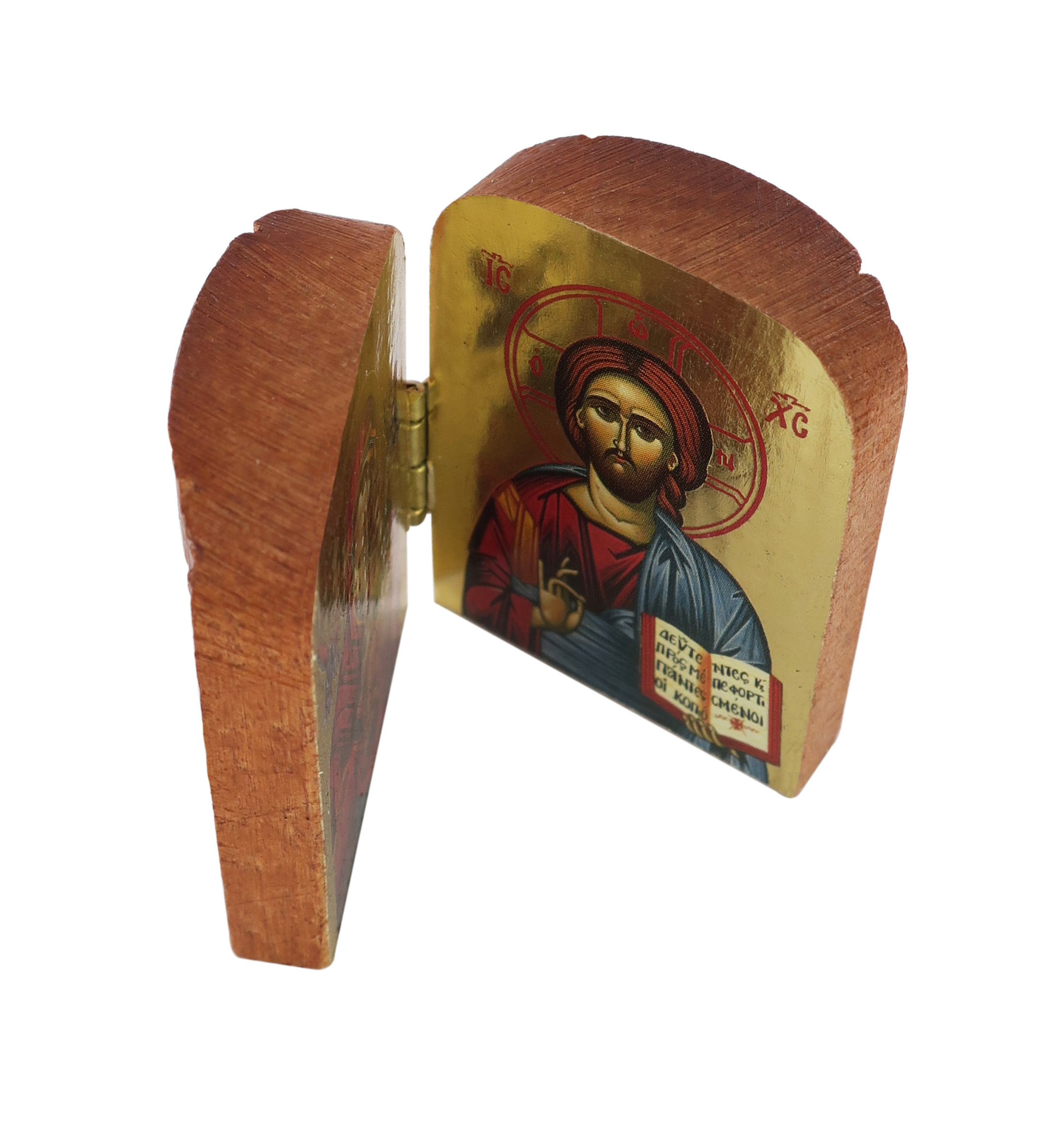 Le immagini sono una stampa a colori su carta lucida applicata su legno. Particolarità di questo prodotto, in confronto agli altri della medesima linea prodotta in Grecia, è lo sfondo color oro, lucido e riflettente, che dona luminosità alle figure e attribuisce a questo dittico un aspetto pregiato. Dalla forma arrotondata nella parte superiore, questo mini-dittico può essere un'idea regalo per occasioni come cresime, comunioni, matrimoni, anniversari, ecc.