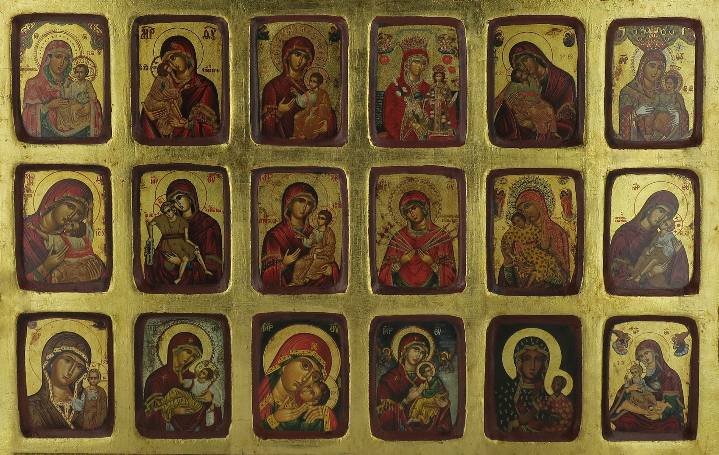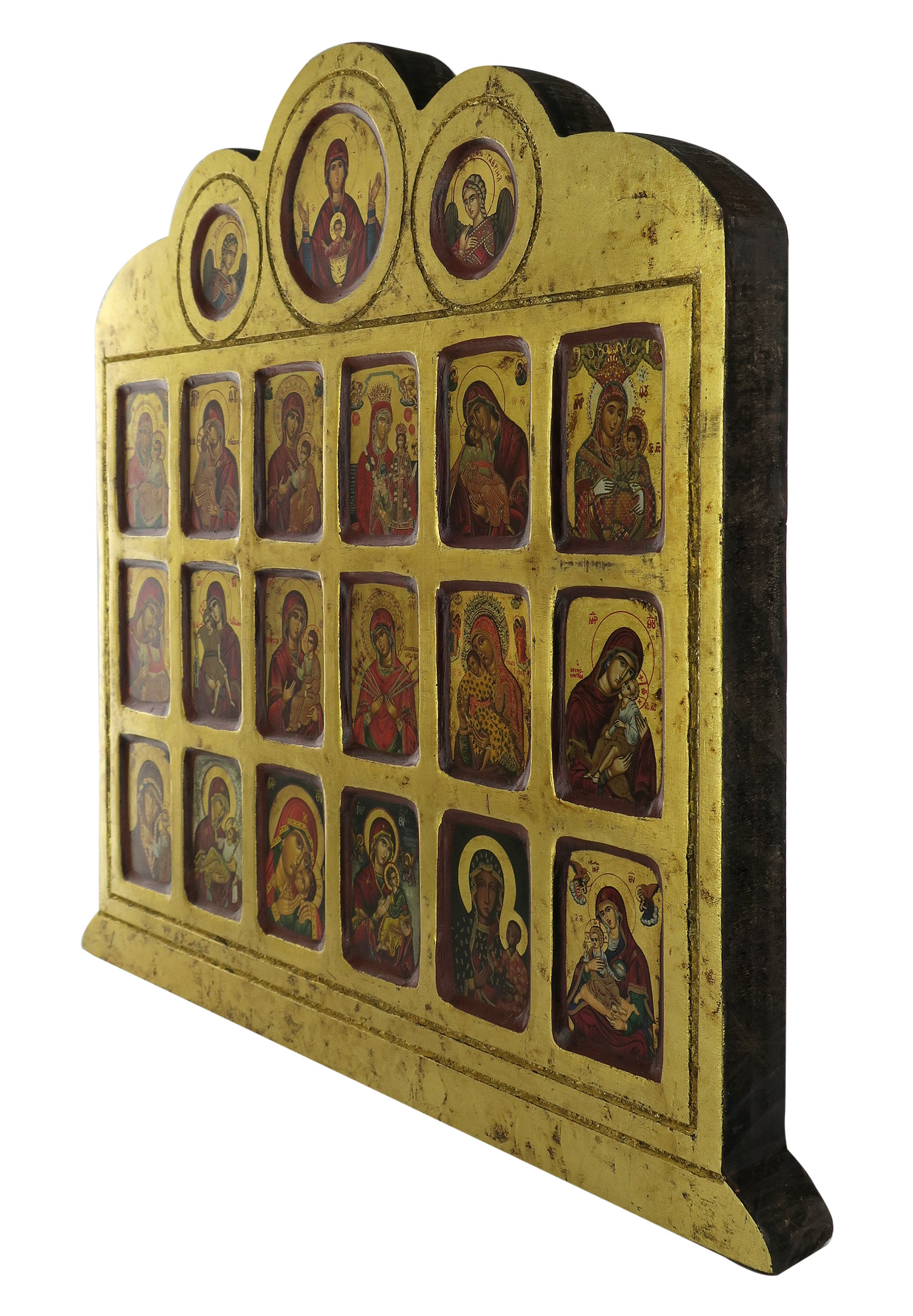 Questa grande icona da parete di legno presenta 19 immagini che raffigurano la Madonna, quasi sempre insieme al Bambino. Si tratta di un grande quadretto che si sviluppa in larghezza, che ospita 3 file di immagini rettangolari da 6 raffigurazioni mariane ognuna. Sono delle icone appartenenti a vari gruppi: c'è la Madonna Eleousa (della Tenerezza), la Vergine di tipo ieratico dell'Odigitria e Maria Regina («Kyriotissa»). L'unica rappresentazione in cui la Madonna non è con il Bambino è quella della Santissima Theotokos "Semistrelnaya" (chiamata anche "L’addolcimento del cuore malvagio" o "La profezia di Simeone"), il cui cuore è trafitto da 7 spade.