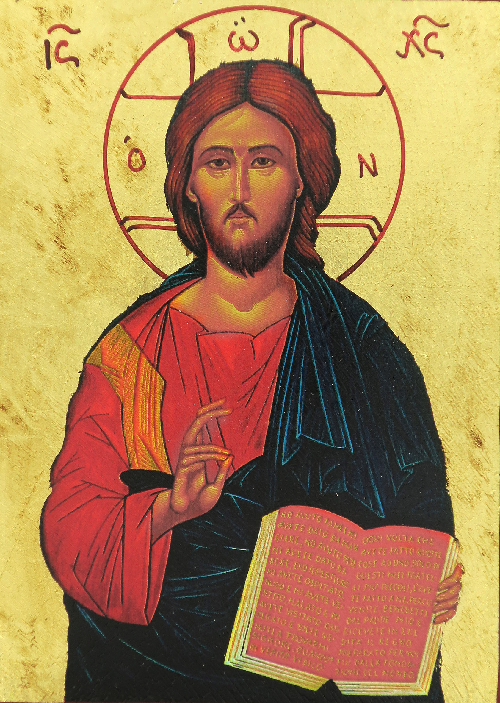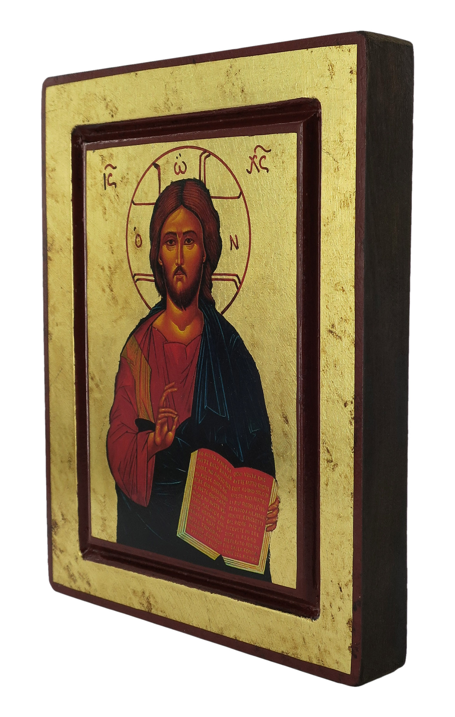 Icona Cristo Pantocratore con libro aperto, Icona in Stile Arte Bizantina, Icona su Legno Rifinita con Aureole, Scritte e Bordure Fatte a Mano, Produzione Greca - 17 x 13,5 cm