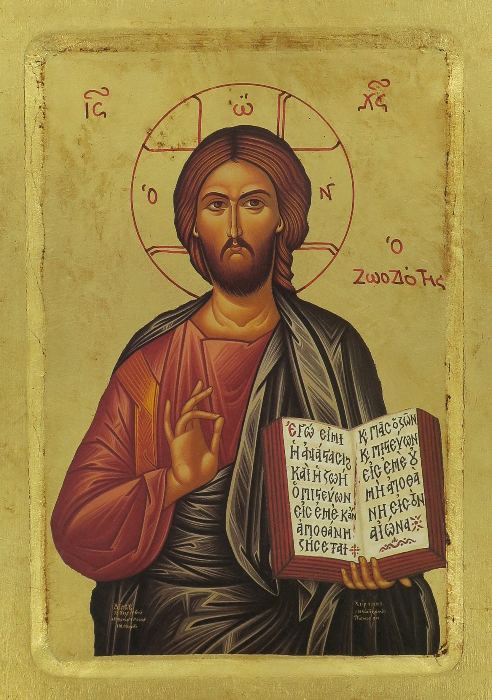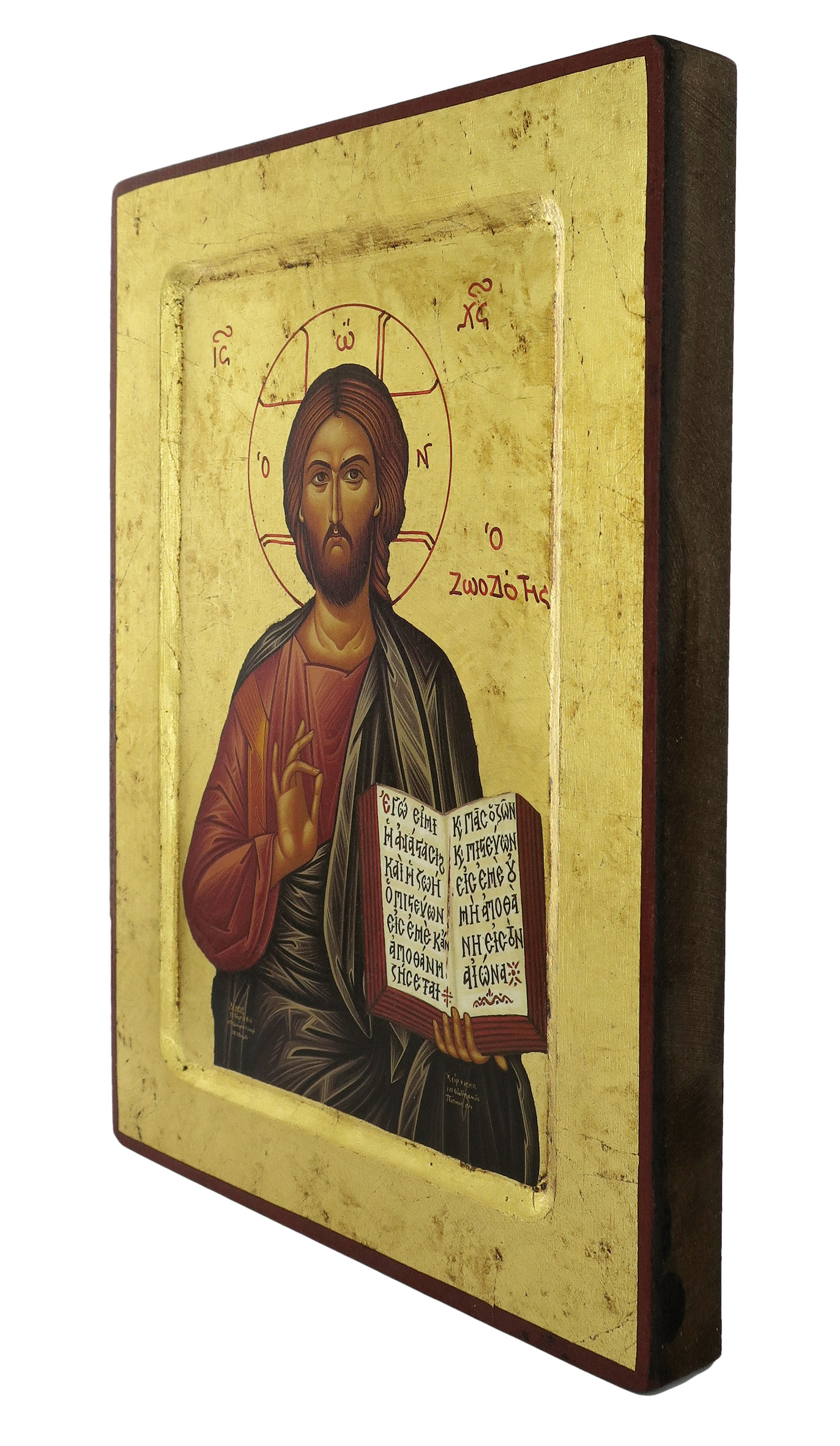 Icona Cristo Pantocratore con libro aperto, Icona in Stile Arte Bizantina, Icona su Legno Rifinita con Aureole, Scritte e Bordure Fatte a Mano, Produzione Greca - 25,5 x 18,5 Cm