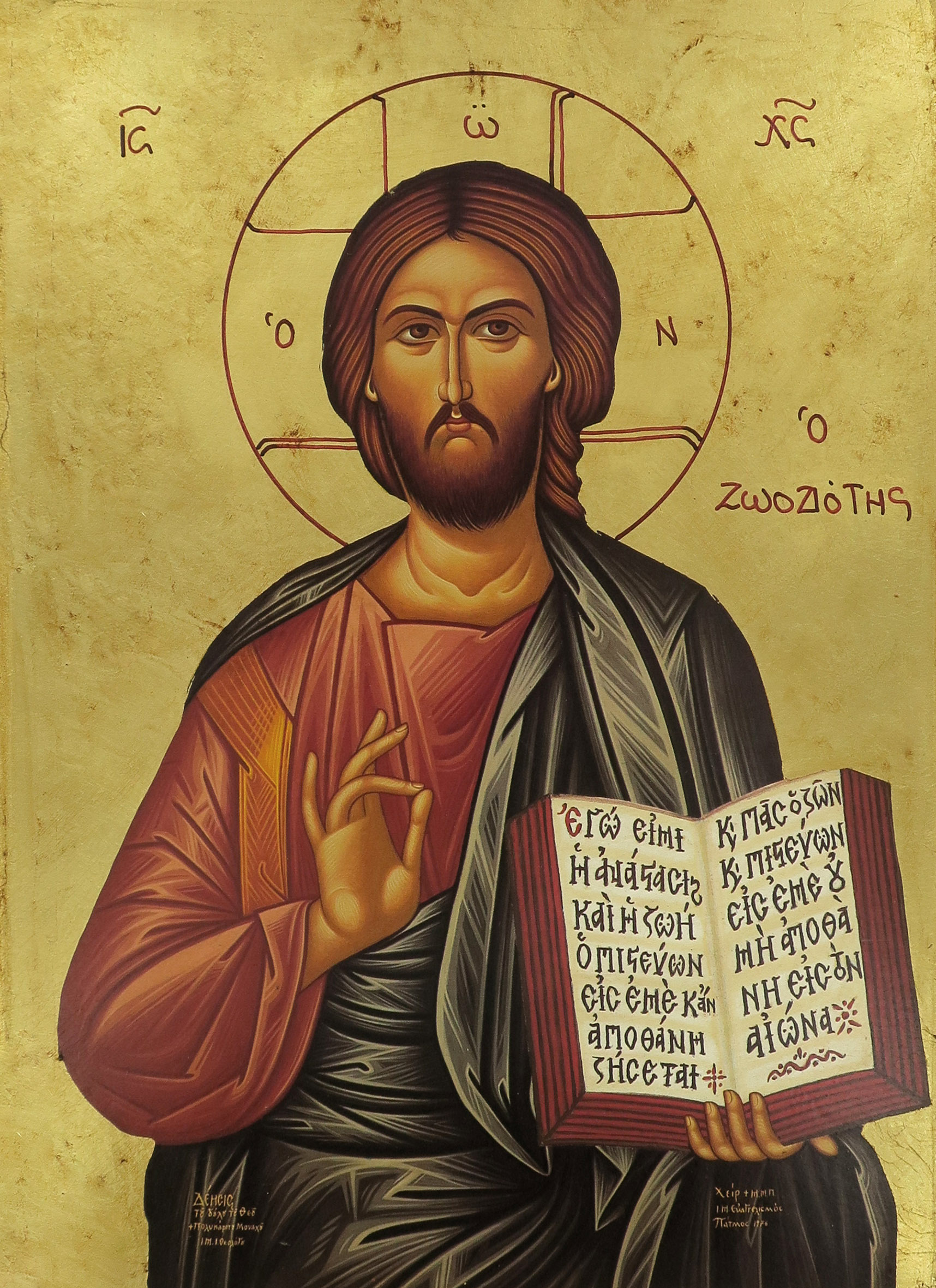 Grande icona da parete, di forma rettangolare, che raffigura Gesù Pantocratore. Si tratta di una copia d'arte bizantina: l'immagine di Cristo con il libro aperto e la mano benedicente è una fine litografia incollata su legno e rifinita con foglia d'oro, mentre le aureole, le scritte e i bordi sono realizzati a mano. Il bordo del quadretto, in rilievo con smussatura, funge da cornice alla rappresentazione. Il gancio sul retro consente di appendere l'icona al muro.