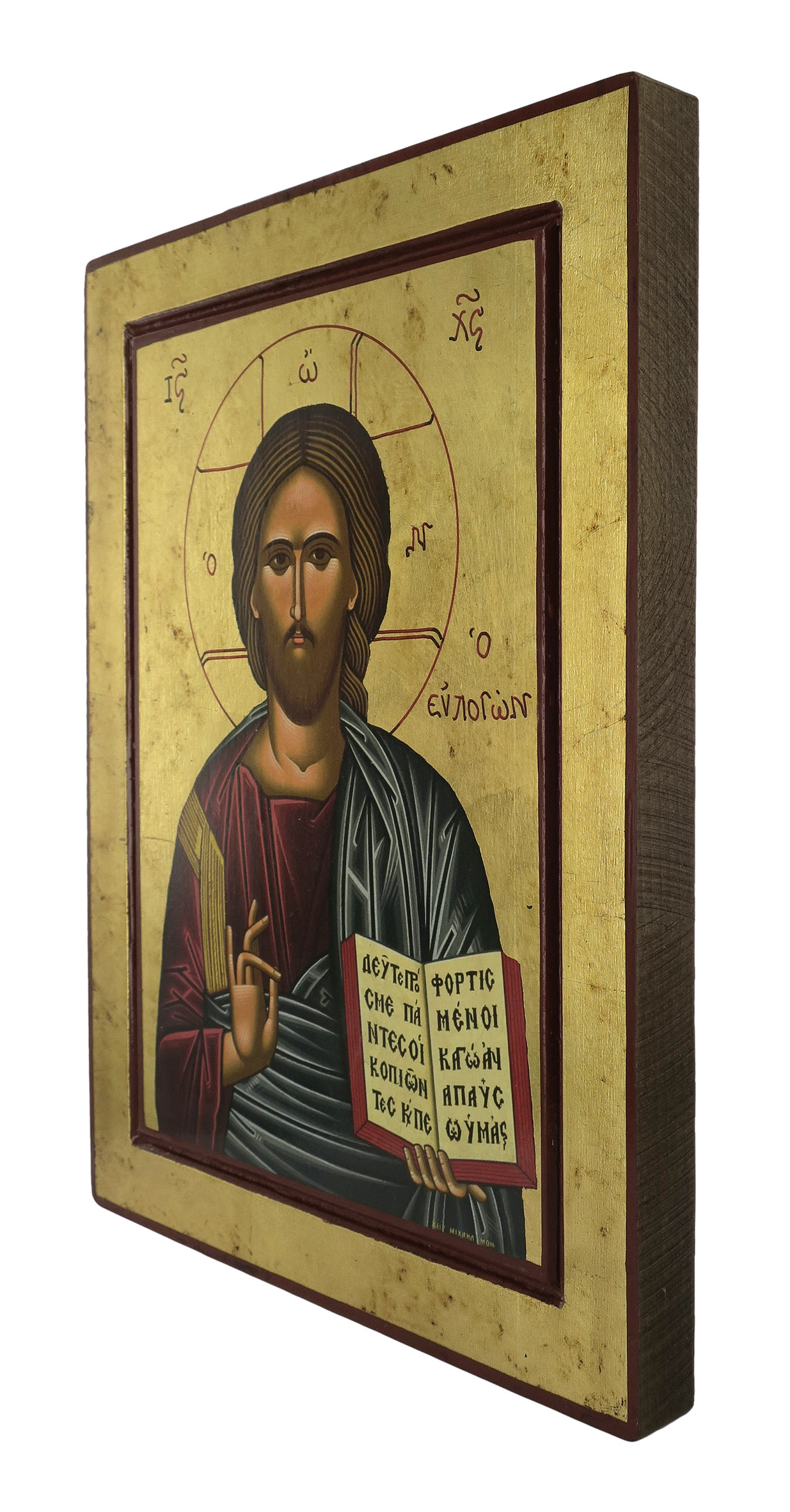 Icona Cristo Pantocratore con libro aperto, Icona in Stile Arte Bizantina, Icona su Legno Rifinita con Aureole, Scritte e Bordure Fatte a Mano, Produzione Greca - 32 x 24,5 Cm