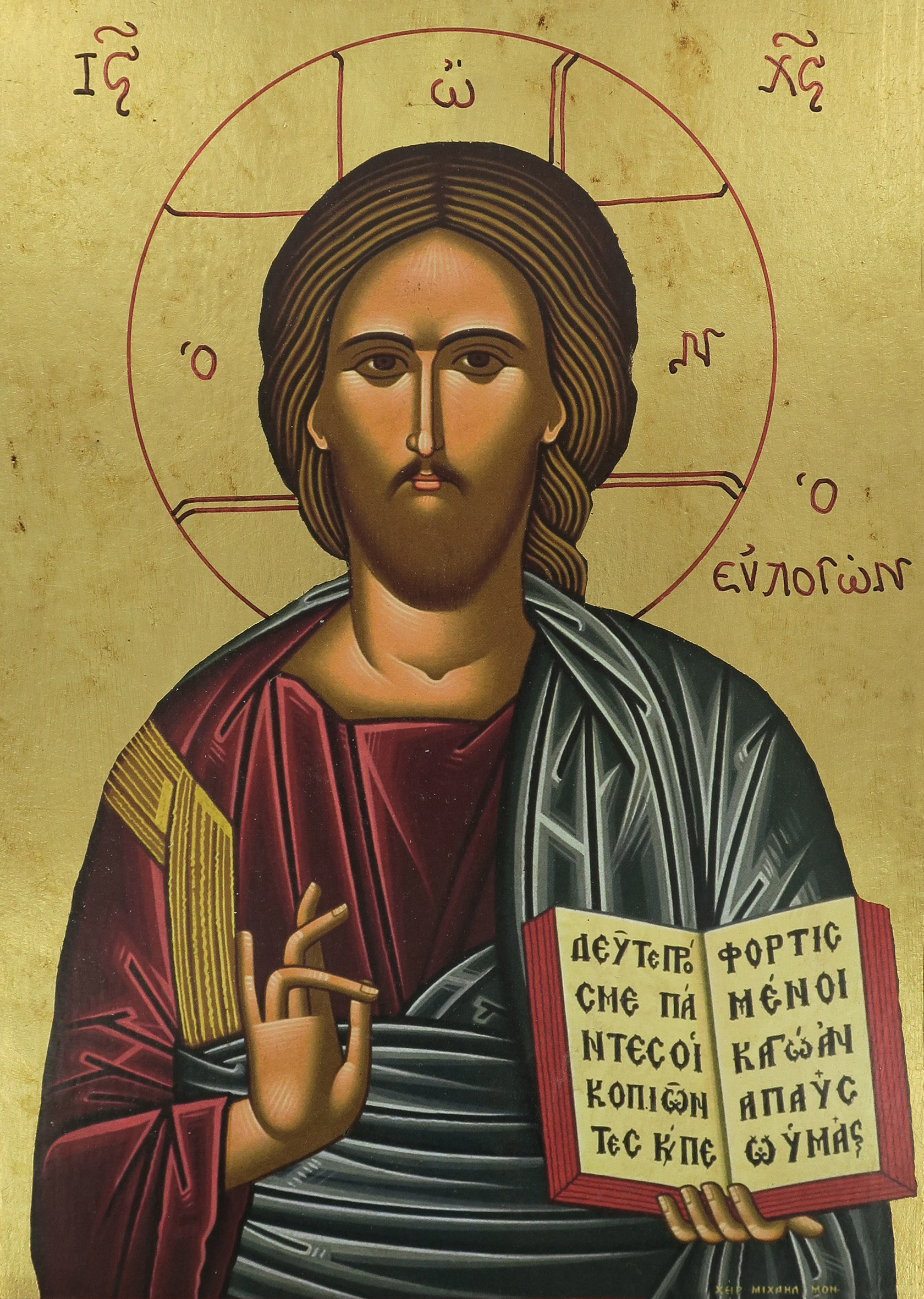 Icona da parete, di forma rettangolare, che raffigura Gesù Pantocratore. Si tratta di una copia d'arte bizantina: l'immagine di Cristo con il libro aperto e la mano benedicente è una fine litografia incollata su legno e rifinita con foglia d'oro, mentre le aureole, le scritte e i bordi sono realizzati a mano. Il contorno interno, incassato, divide la rappresentazione centrale dal bordo, che diventa una cornice. Il gancio sul retro consente di appendere l'icona al muro.