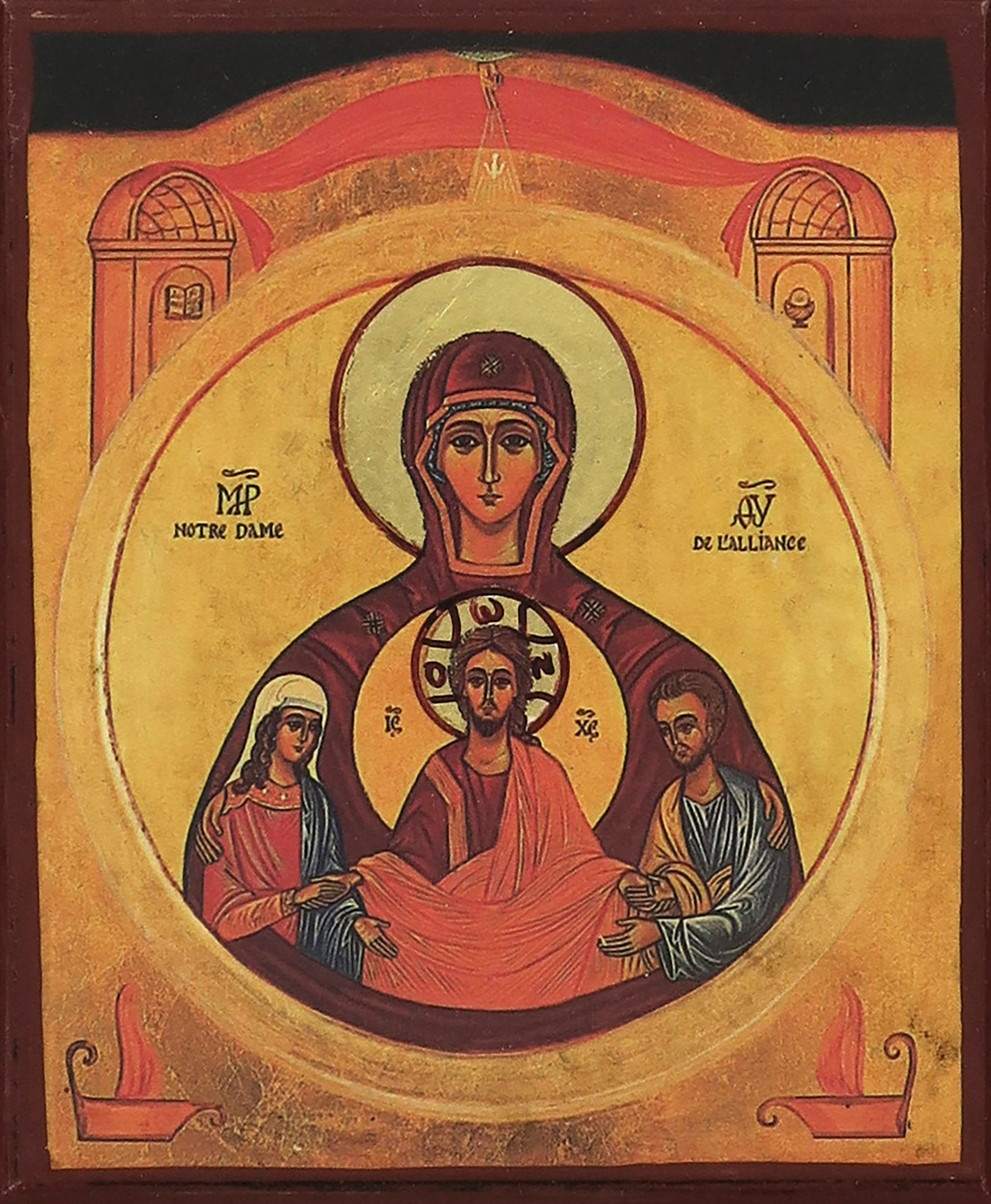 Icona da parete, dalla forma quasi quadrata, che raffigura la Vergine dell'Alleanza, soggetto esposto nella chiesa di S. Carlo Borromeo a Londra. In tale rappresentazione, la Vergine Maria rappresenta la Chiesa e poggia le proprie mani sulle spalle dello sposo e della sposa. Al centro della scena, i due sposi tendono la propria mano l'uno verso l'altro, come manifestazione della loro volontà a intraprendere il percorso del matrimonio insieme. Tra i due sposi trova posto il Signore, che tiene loro le mani. Sopra alla scena, un drappo rosso che simboleggia la Shekinah, gloria di Dio e sua presenza, la mano di Dio da cui partono dei raggi di luce e una colomba.