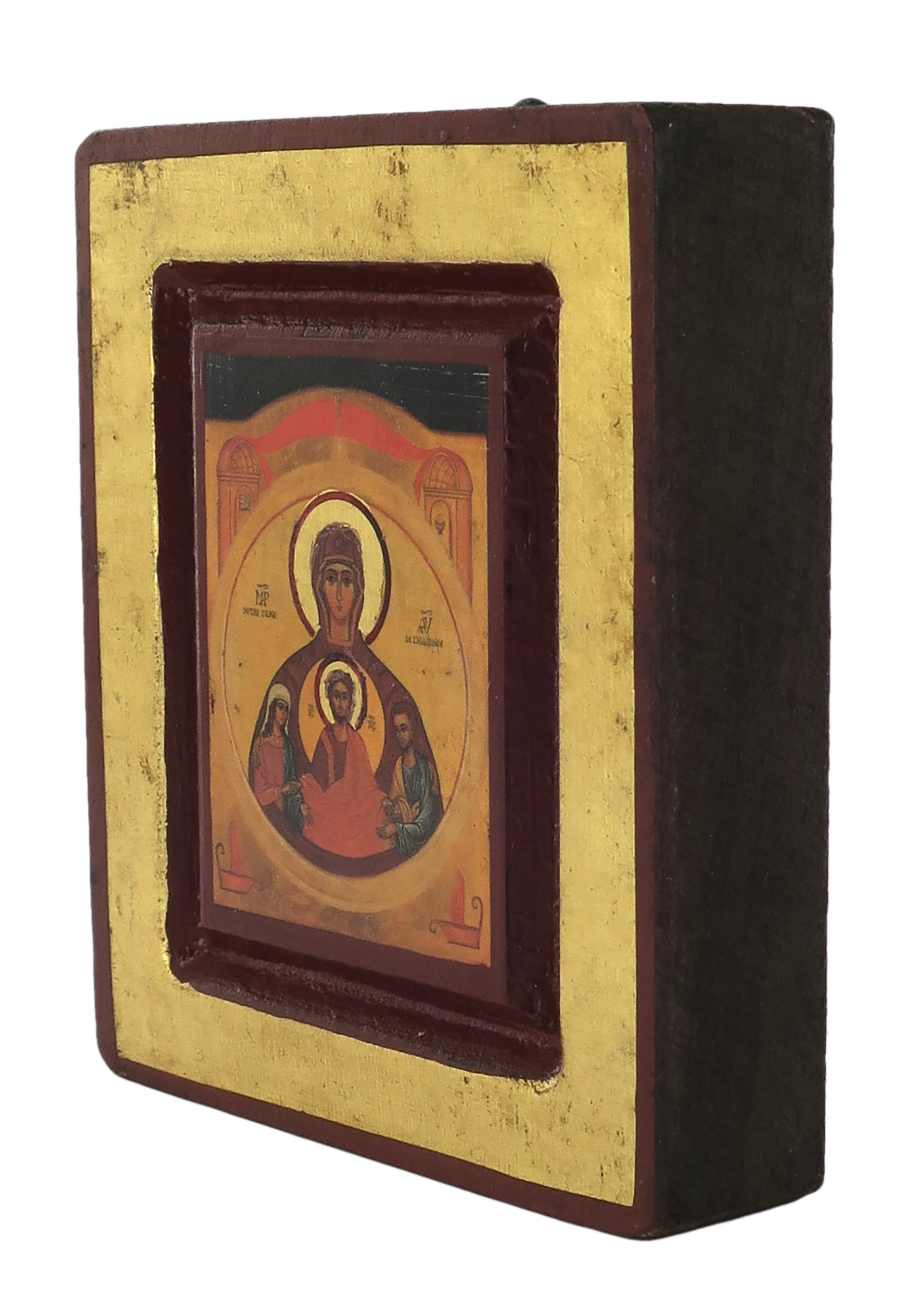 Si tratta di una copia d'arte bizantina. L'immagine è una fine litografia incollata su legno e rifinita con foglia d'oro, mentre le aureole, le scritte e i bordi sono realizzati a mano. Grazie al bordo interno incassato di colore bordeaux, che dona ulteriore risalto ai soggetti, quello esterno spicca, fungendo da cornice alla rappresentazione. Il gancio sul retro consente di appendere l'icona al muro. Considerando il soggetto, è particolarmente indicata come regalo per sposi, anniversari di matrimonio e conferme delle promesse.