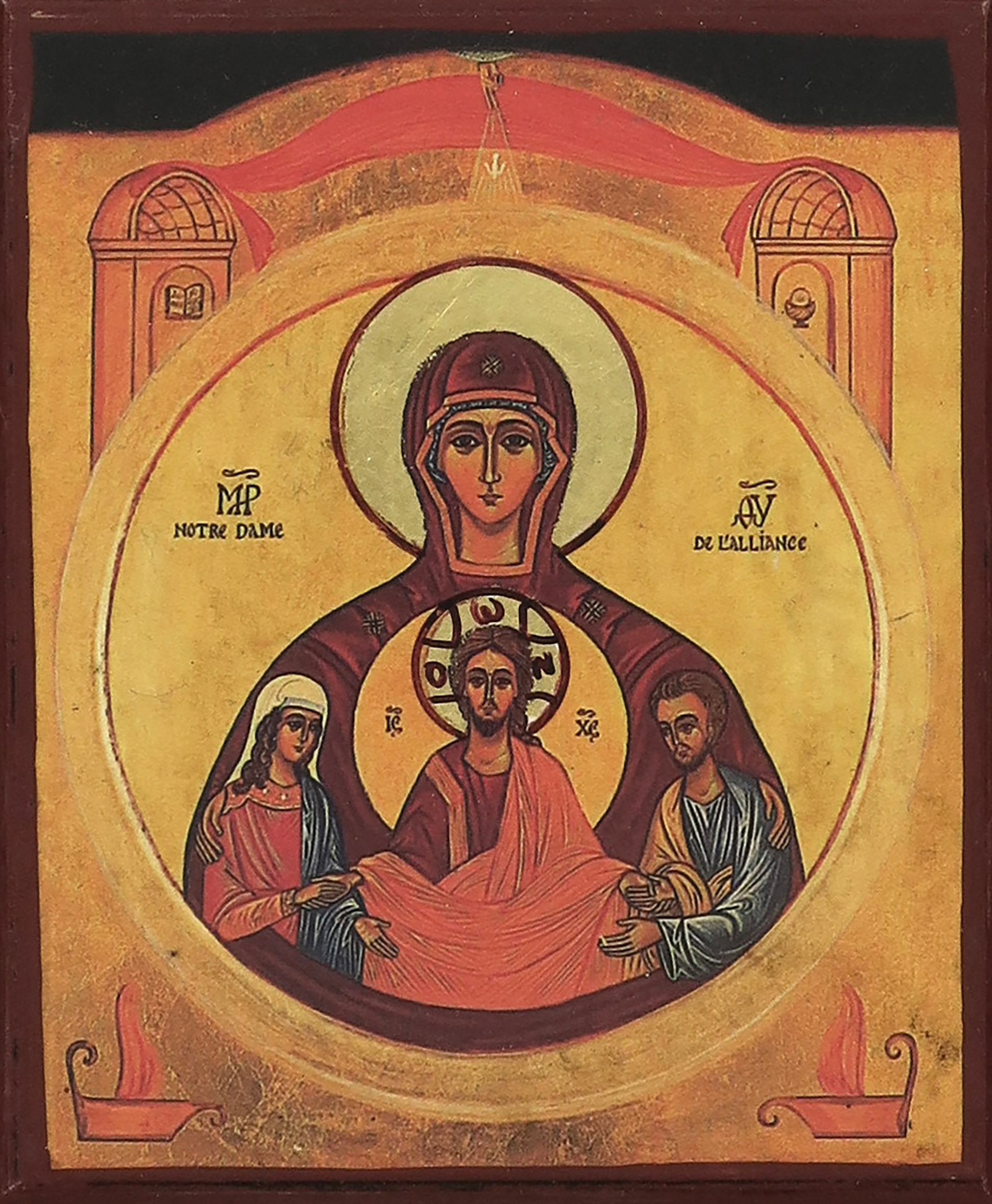 Piccola icona da parete, dalla forma quasi quadrata, che raffigura la Vergine dell'Alleanza, soggetto esposto nella chiesa di S. Carlo Borromeo a Londra. In tale rappresentazione, la Vergine Maria rappresenta la Chiesa e poggia le proprie mani sulle spalle dello sposo e della sposa. Al centro della scena, i due sposi tendono la propria mano l'uno verso l'altro, come manifestazione della loro volontà a intraprendere il percorso del matrimonio insieme. Tra i due sposi trova posto il Signore, che tiene loro le mani. Sopra alla scena, un drappo rosso che simboleggia la Shekinah, gloria di Dio e sua presenza.