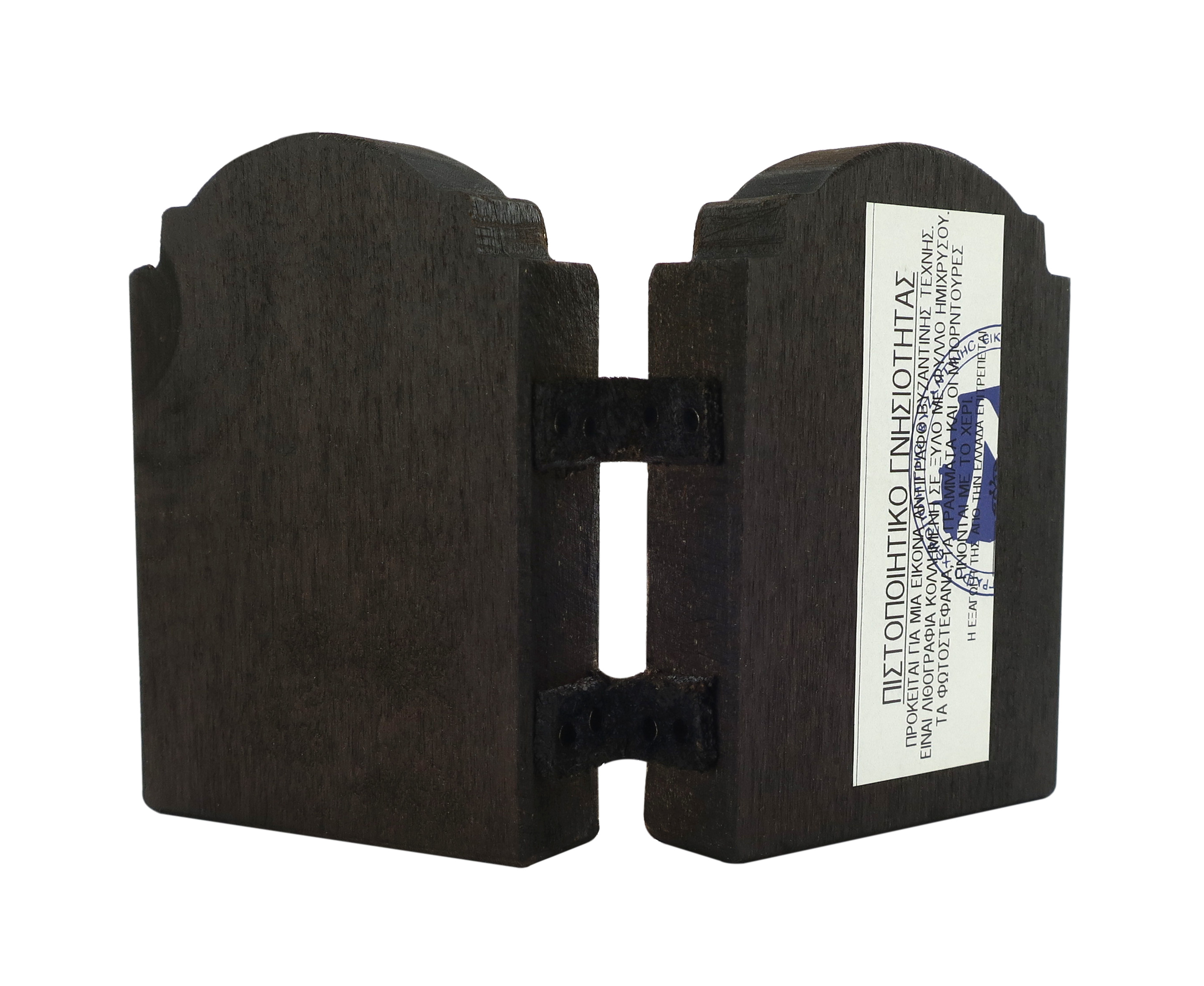 Icona dittico di medie dimensioni che raffigura la Vergine della Tenerezza di Vladimir (altrimenti detta "Theotókos di Vladimir") e il Cristo Pantocratore. Le immagini sono fini litografie incollate su legno e rifinite con foglia d'oro, mentre le aureole, le scritte e i bordi sono realizzati a mano. La parte superiore dei pannelli, dalla linea arrotondata, è abbellita da dolci smussature.