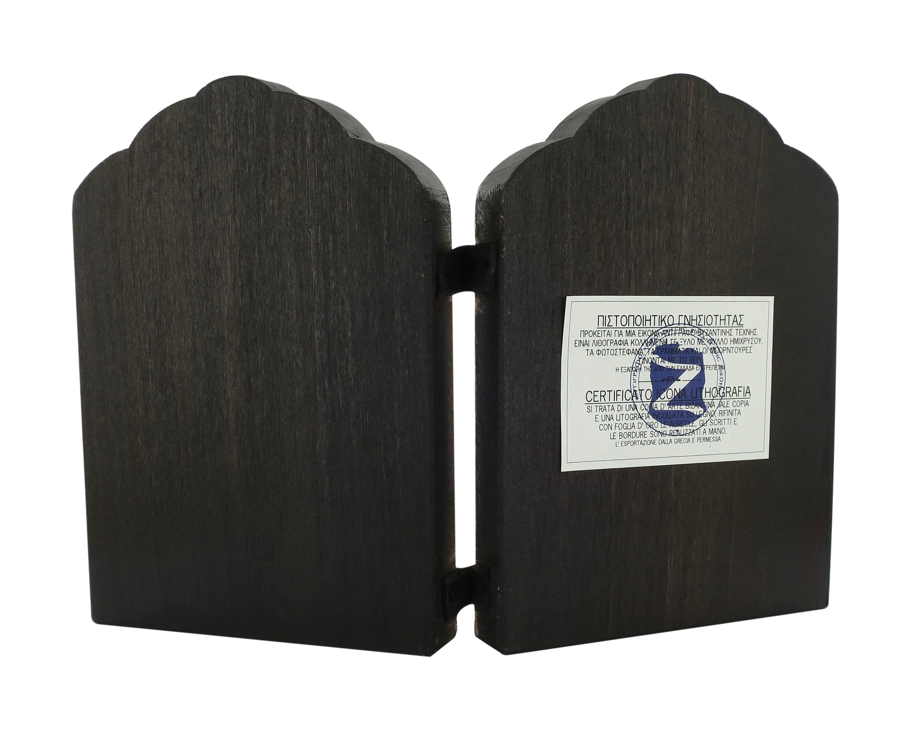 Il certificato sul retro dell'icona attesta la sua provenienza dalla Grecia. Altezza: 18 cm. Larghezza (dittico aperto): 26,5 cm / Spessore: 4 cm.