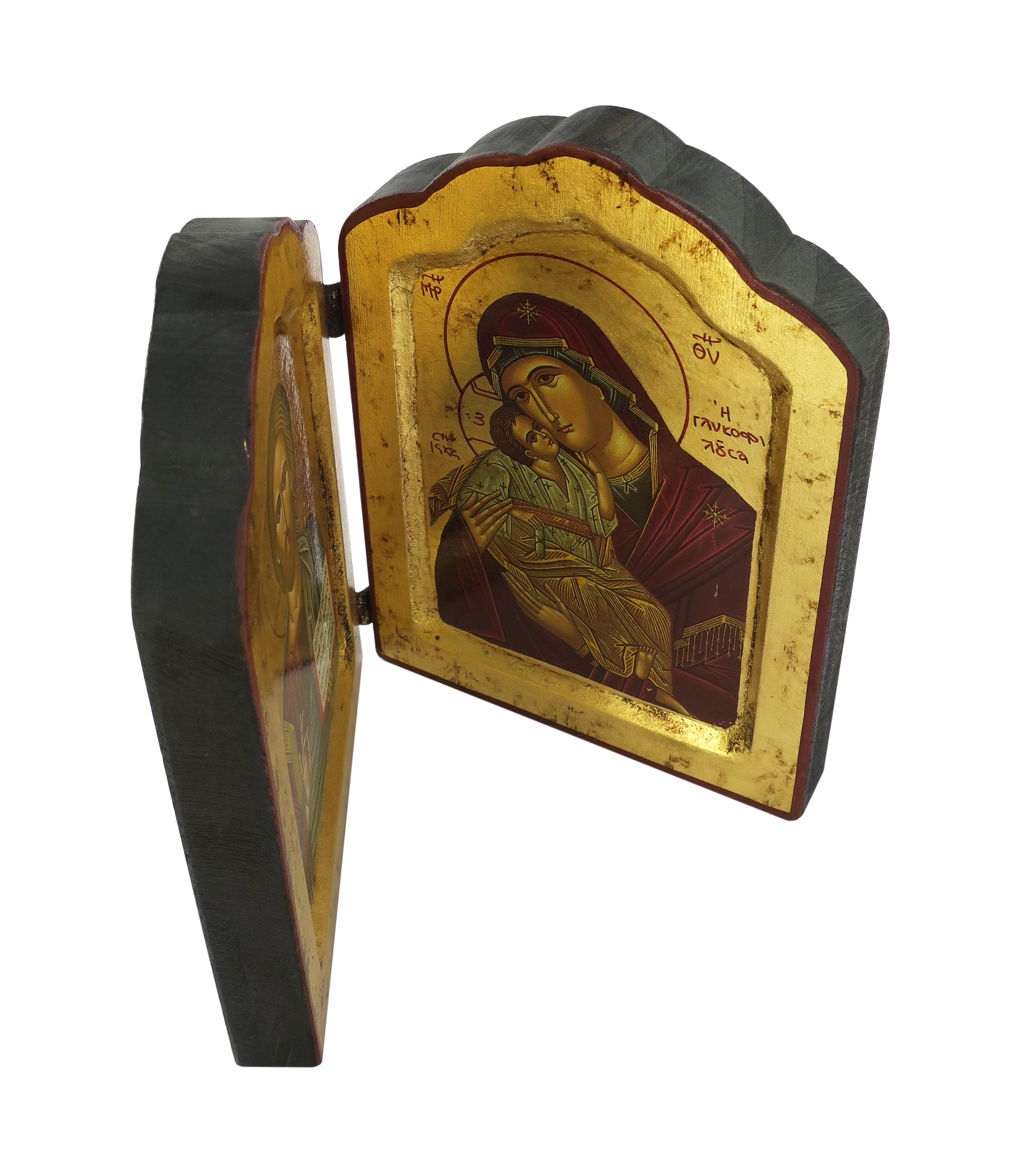 Icona dittico di 18 cm d'altezza che raffigura la Vergine della Tenerezza di Vladimir (altrimenti detta "Theotókos di Vladimir") e il Cristo Pantocratore. Le immagini sono fini litografie incollate su legno e rifinite con foglia d'oro, mentre le aureole, le scritte e i bordi sono realizzati a mano. La parte superiore dei pannelli, dalla linea arrotondata, è abbellita da dolci smussature.