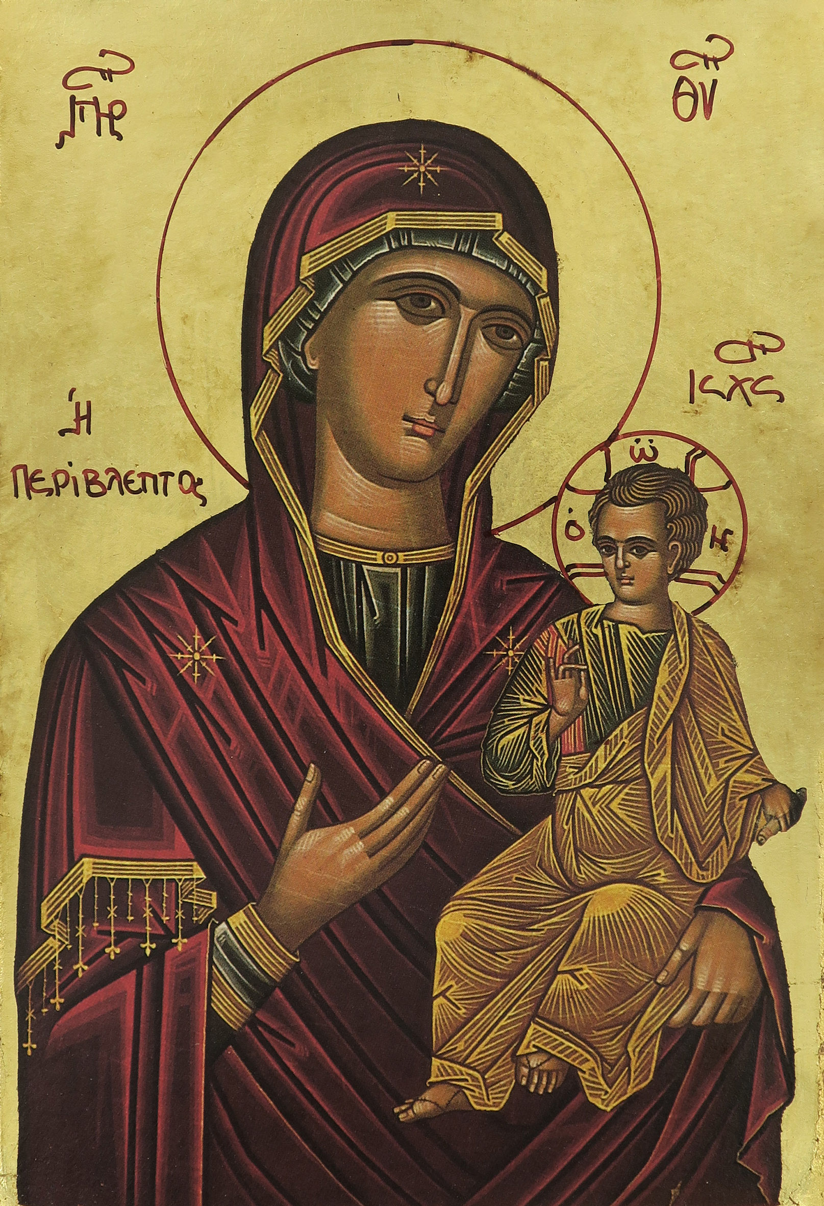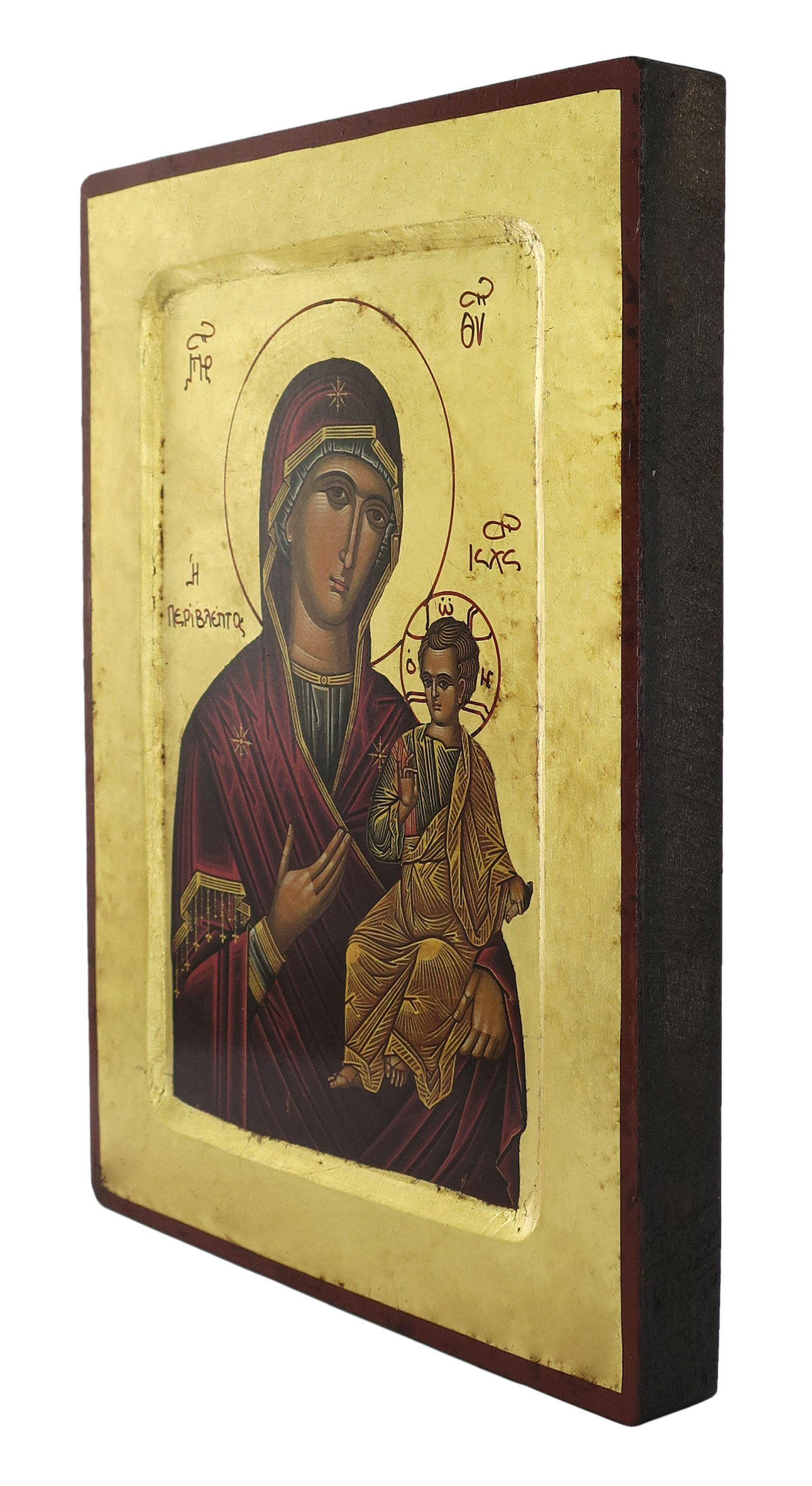 Icona da parete, di forma rettangolare, che raffigura la Vergine con Bambino in braccio. Si tratta di una copia d'arte bizantina: l'immagine è una fine litografia, incollata su legno e rifinita con foglia d'oro, mentre le aureole, le scritte e i bordi sono realizzati a mano. Il bordo del quadretto, in rilievo con smussatura, funge da cornice alla rappresentazione. Il gancio sul retro consente di appendere l'icona al muro.