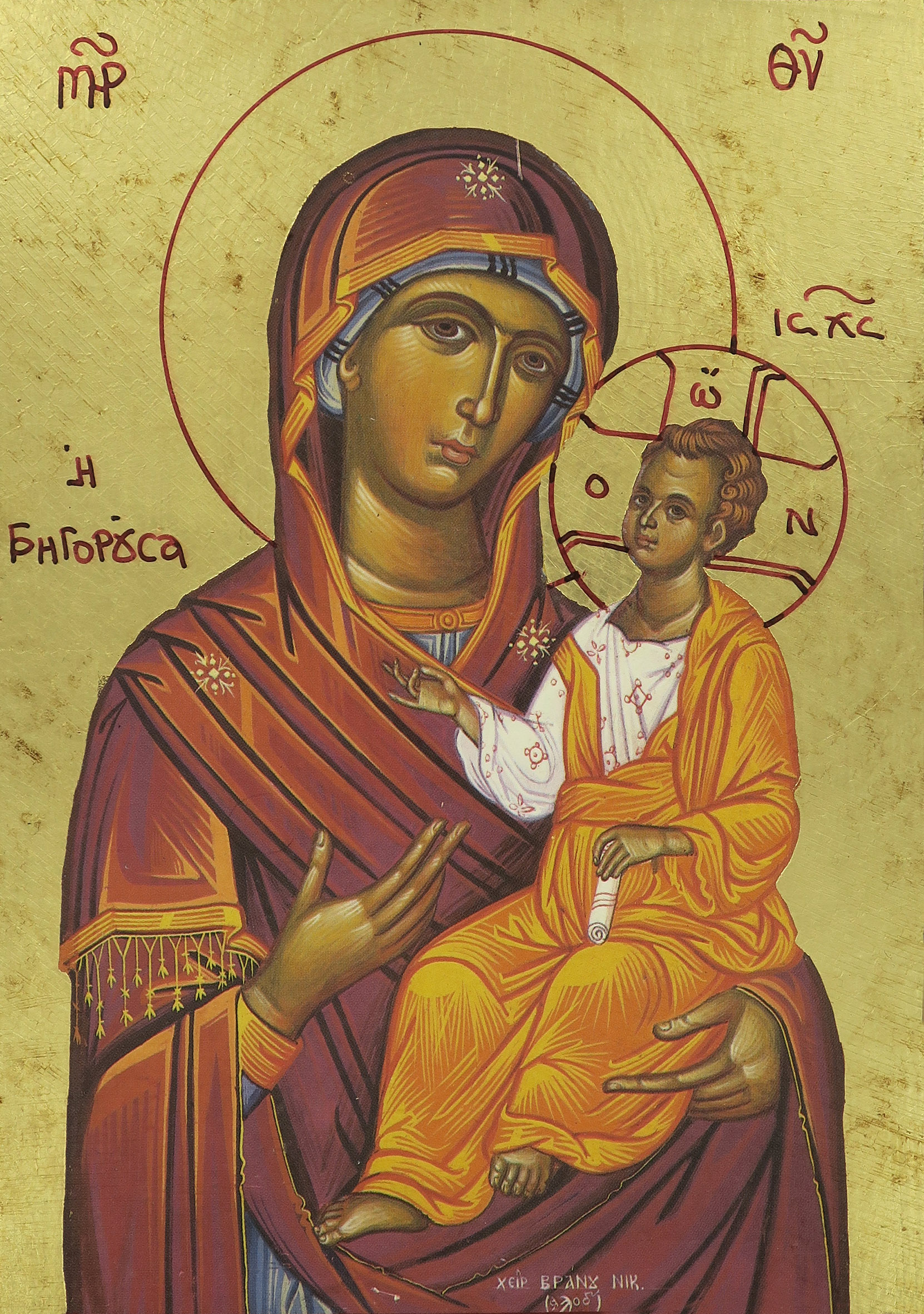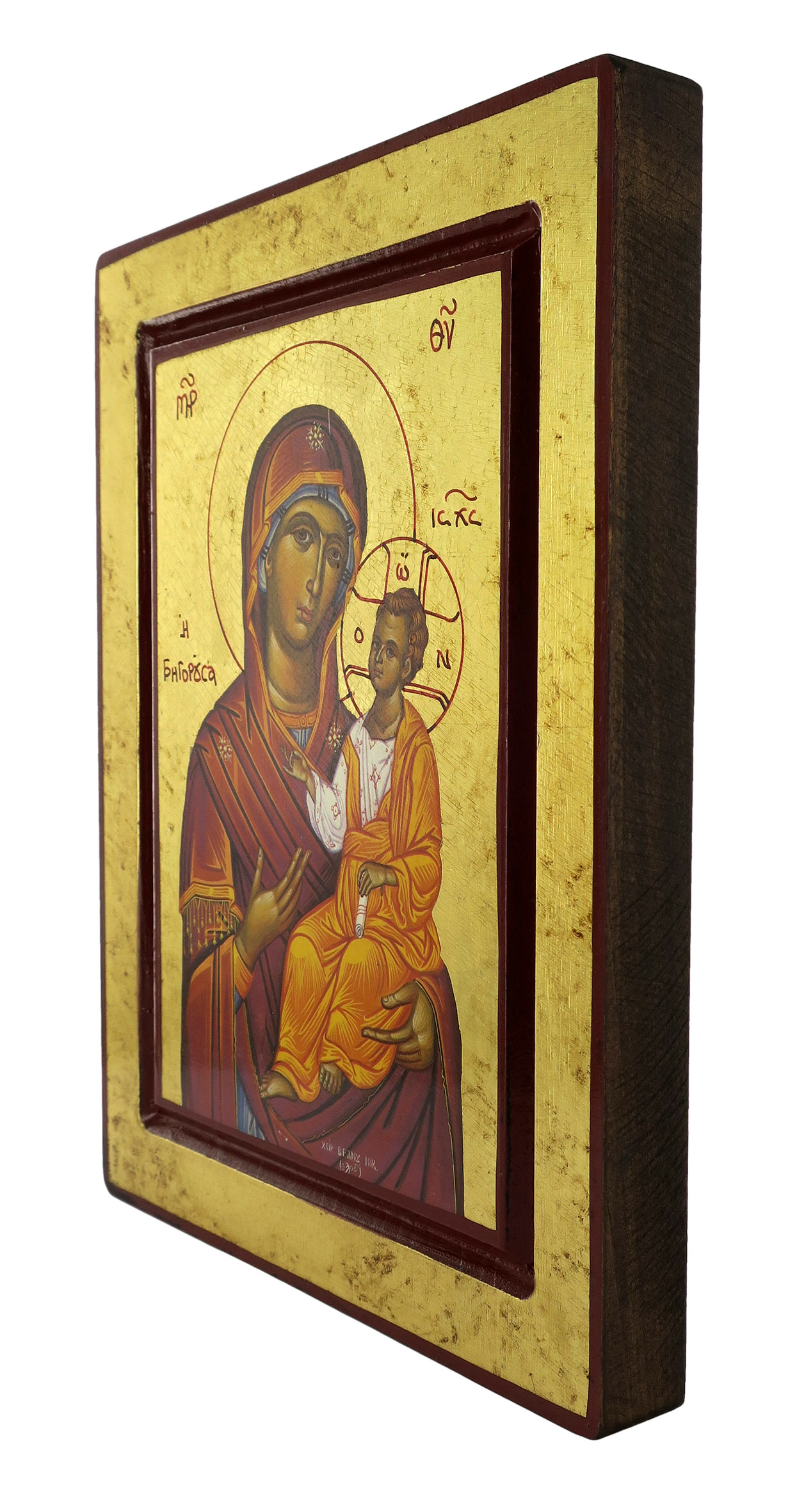 Icona da parete, di forma rettangolare, che raffigura la Vergine con Bambino in braccio. Si tratta di una copia d'arte bizantina: l'immagine è una fine litografia, incollata su legno e rifinita con foglia d'oro, mentre le aureole, le scritte e i bordi sono realizzati a mano. Grazie al bordo interno incassato di colore bordeaux, che dona ulteriore risalto ai soggetti, quello esterno spicca, fungendo da cornice alla rappresentazione. Il gancio sul retro consente di appendere l'icona al muro.