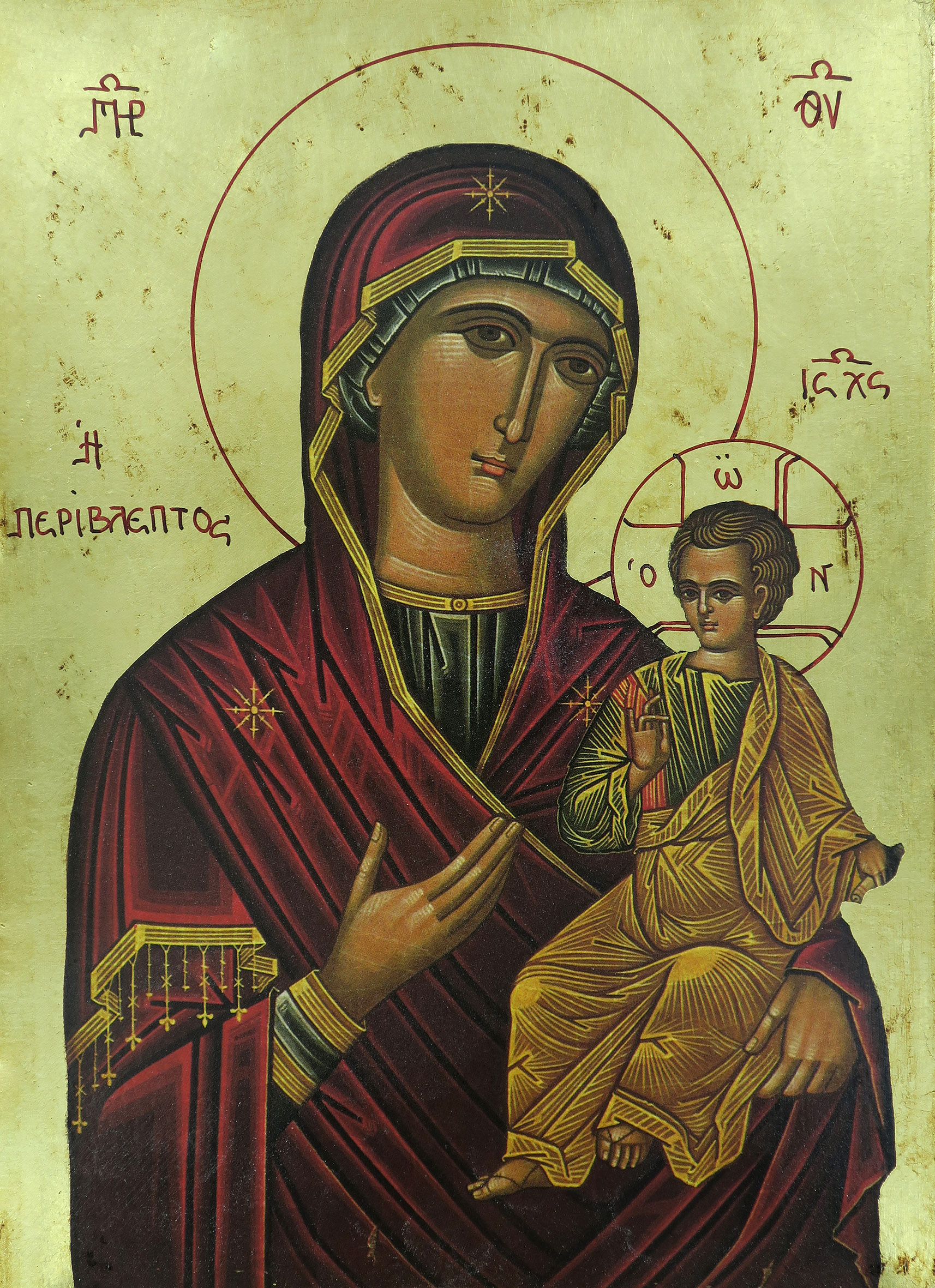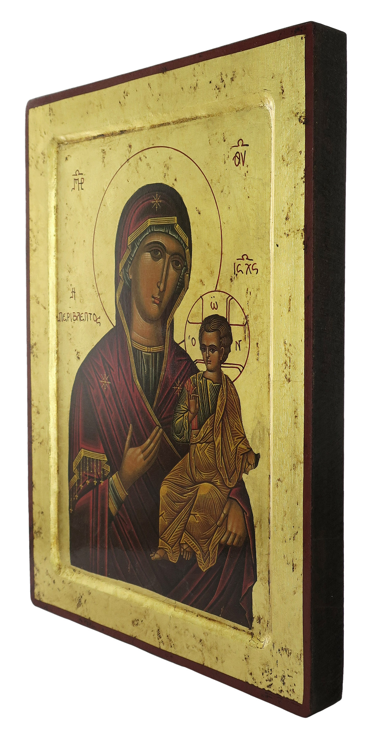 Grande icona da parete, di forma rettangolare, che raffigura la Vergine con Bambino in braccio. Si tratta di una copia d'arte bizantina: l'immagine è una fine litografia, incollata su legno e rifinita con foglia d'oro, mentre le aureole, le scritte e i bordi sono realizzati a mano. Il bordo del quadretto, in rilievo con smussatura, funge da cornice alla rappresentazione. Il gancio sul retro consente di appendere l'icona al muro.