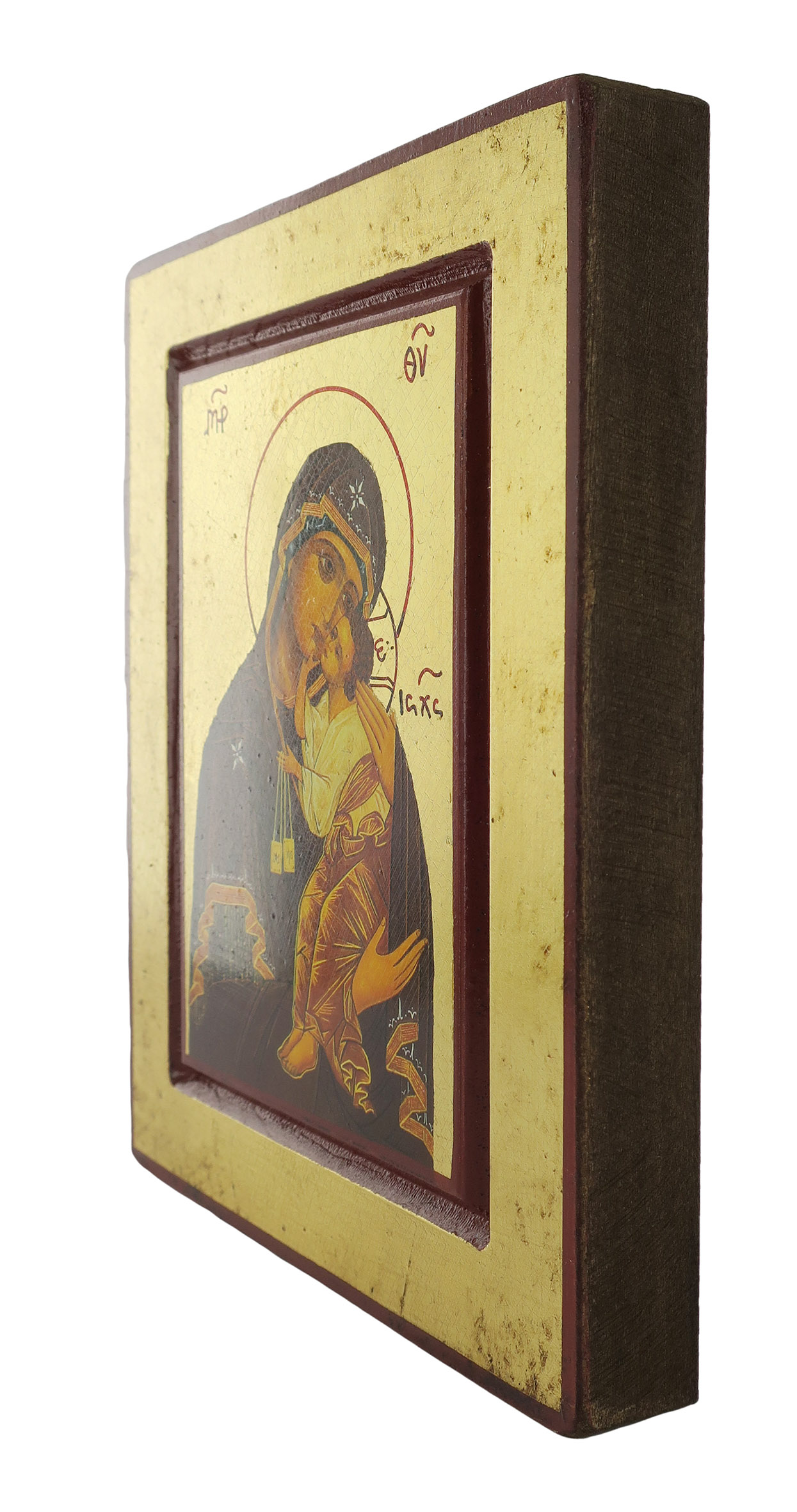 L'immagine è una fine litografia incollata su legno e rifinita con foglia d'oro, mentre le aureole, le scritte e i bordi sono realizzati a mano. Grazie al bordo interno incassato di colore bordeaux, che dona ulteriore risalto ai soggetti, quello esterno spicca, fungendo da cornice alla rappresentazione. Un delicato effetto anticato dona all'oggetto ulteriore pregio. Il gancio sul retro consente di appendere l'icona al muro. Considerando il tema di questo quadretto-icona, è particolarmente indicata come idea regalo per i devoti mariani.