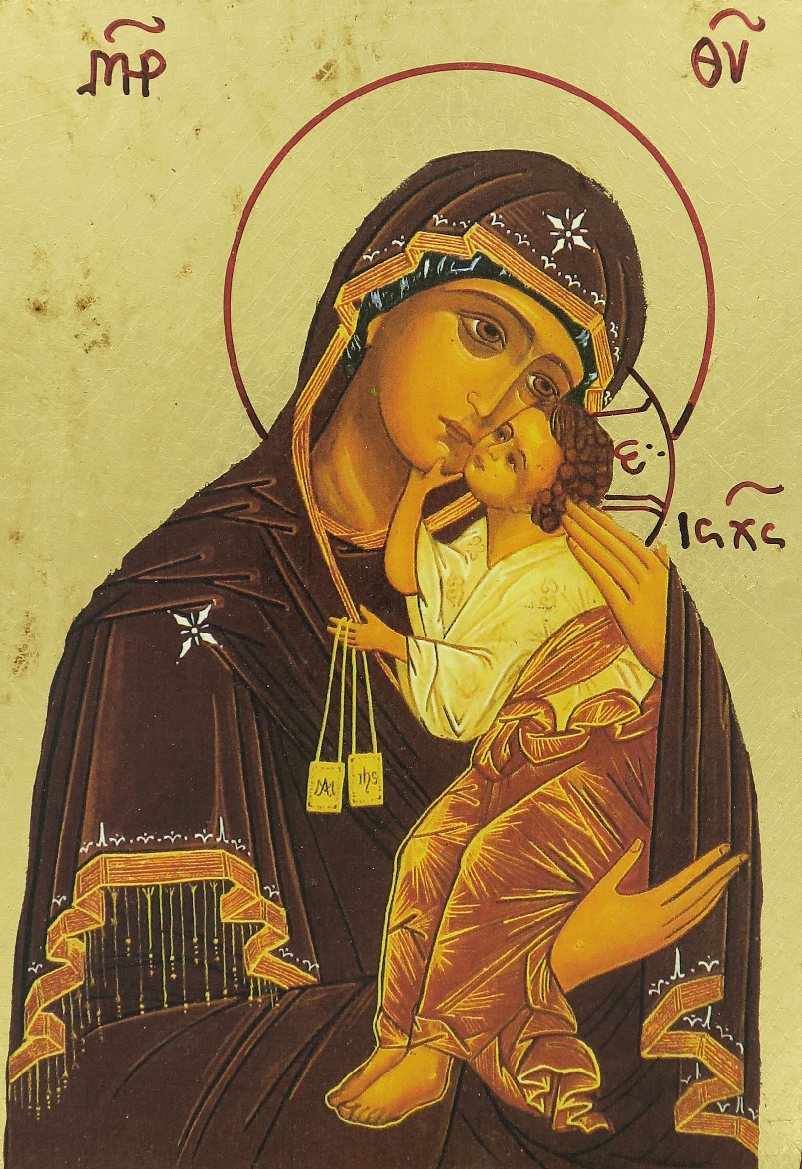Icona da parete che raffigura la Madonna del Carmine. Si tratta della Madonna apparsa, insieme al Bambino, al beato Simone Stock il giorno 16 luglio 1251 sul promontorio dell’Alta Galilea, durante la quale la donna donò al santo lo scapolare con il “privilegio sabatino” (promessa di salvezza), annunciandogli che chiunque l'avrebbe indossato nel momento della morte avrebbe evitato le pene del Purgatorio.