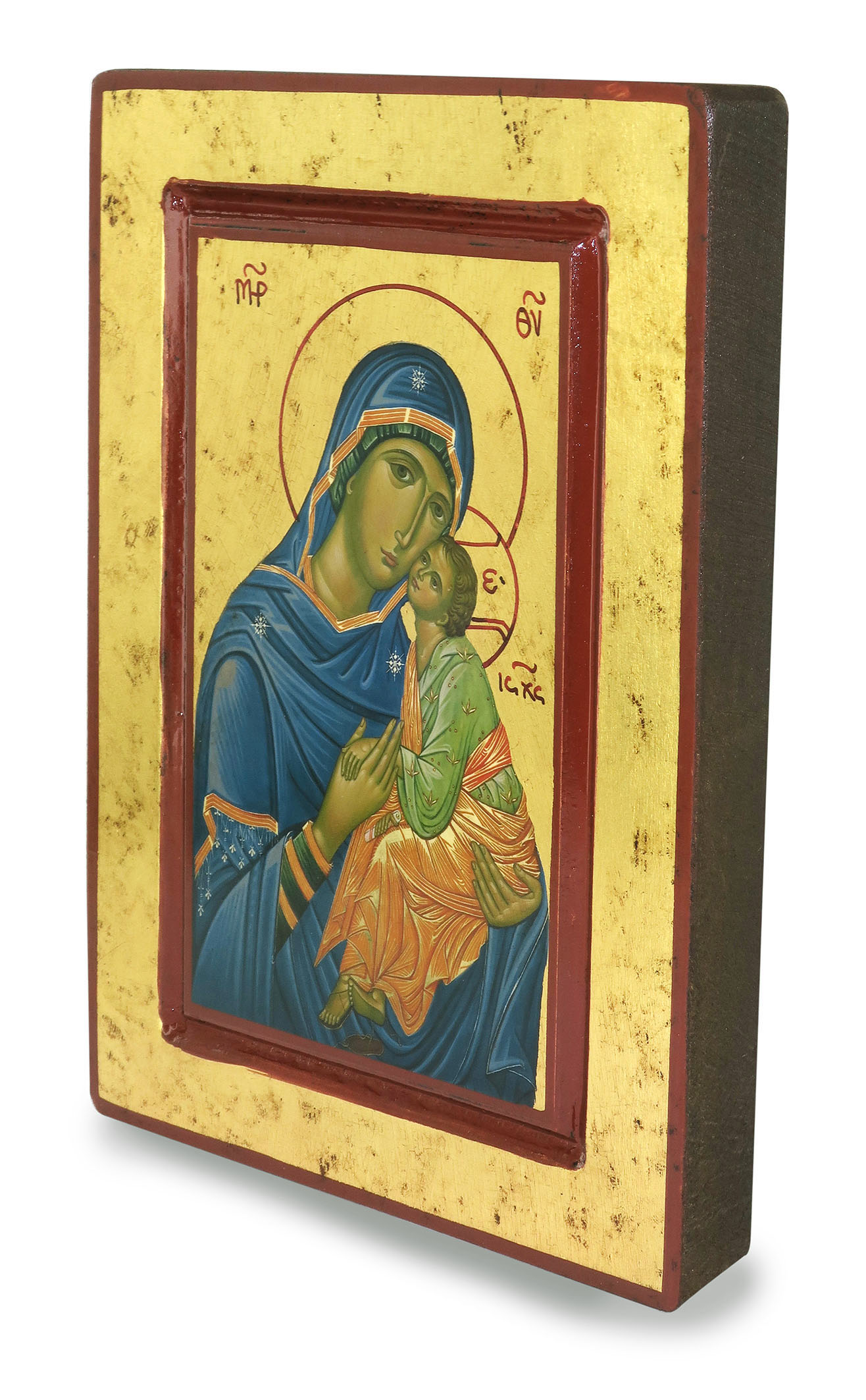Icona da parete, di forma rettangolare, che raffigura la Vergine della Tenerezza. Si tratta di una copia d'arte bizantina: l'immagine è una fine litografia di una Madonna con Bambino, incollata su legno e rifinita con foglia d'oro, mentre le aureole, le scritte e i bordi sono realizzati a mano. Il contorno interno, incassato, divide la rappresentazione centrale dal bordo esterno, facendo sembrare quest'ultimo una cornice. Il gancio sul retro consente di appendere l'icona al muro.