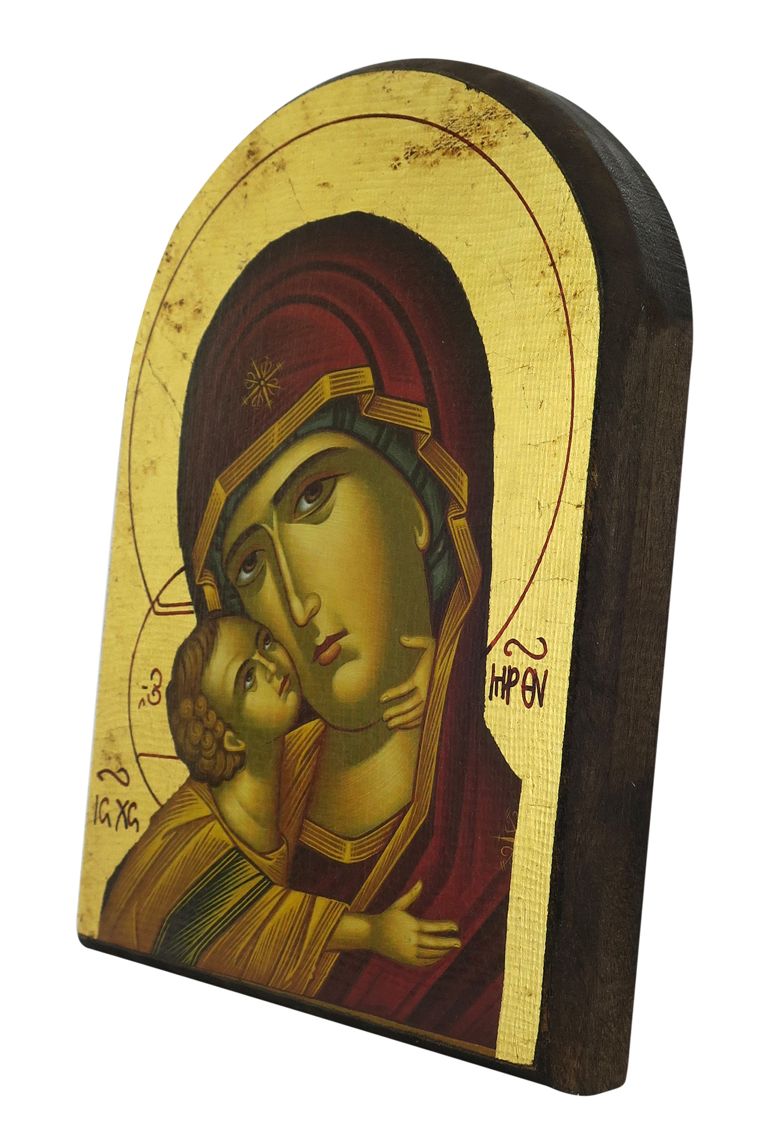 Icona Madonna della Tenerezza, Vergine di Vladimir, Icona in Stile Arte Bizantina, Icona su Legno Rifinita con Aureole, Scritte e Bordure Fatte a Mano, Produzione Greca - 18,5 x 14 Cm