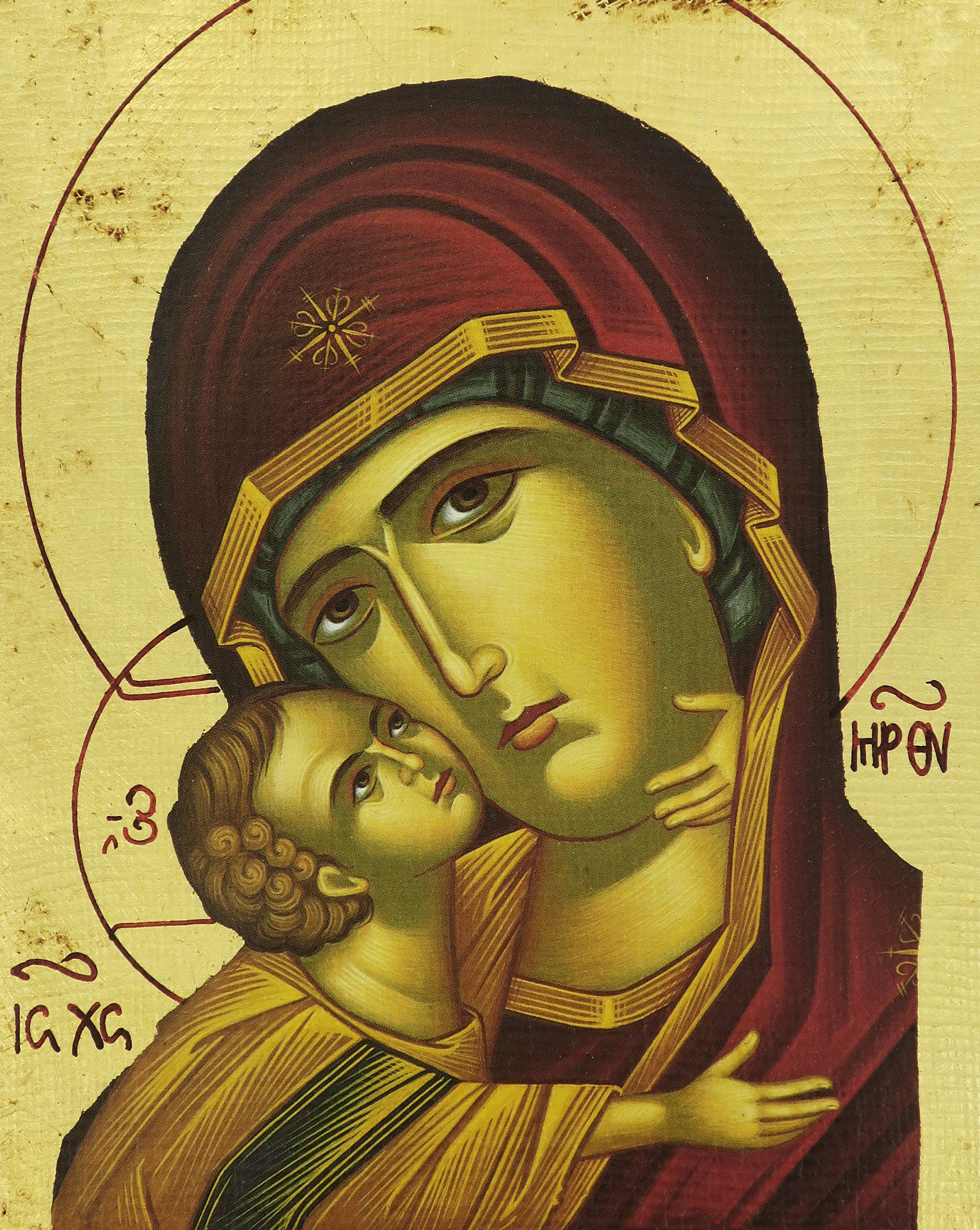Icona ad arco che raffigura la Vergine della Tenerezza di Vladimir (altrimenti detta "Theotókos di Vladimir"). Si tratta di una copia d'arte bizantina: l'icona originale della Madre di Dio della Tenerezza, a cui questa riproduzione si ispira, fu dipinta a Costantinopoli nel XII secolo ed è conservata a Mosca. Tra le icone ortodosse più venerate al mondo, la Theotókos ("Madre di Dio" in greco) è la figura protettrice della Russia.