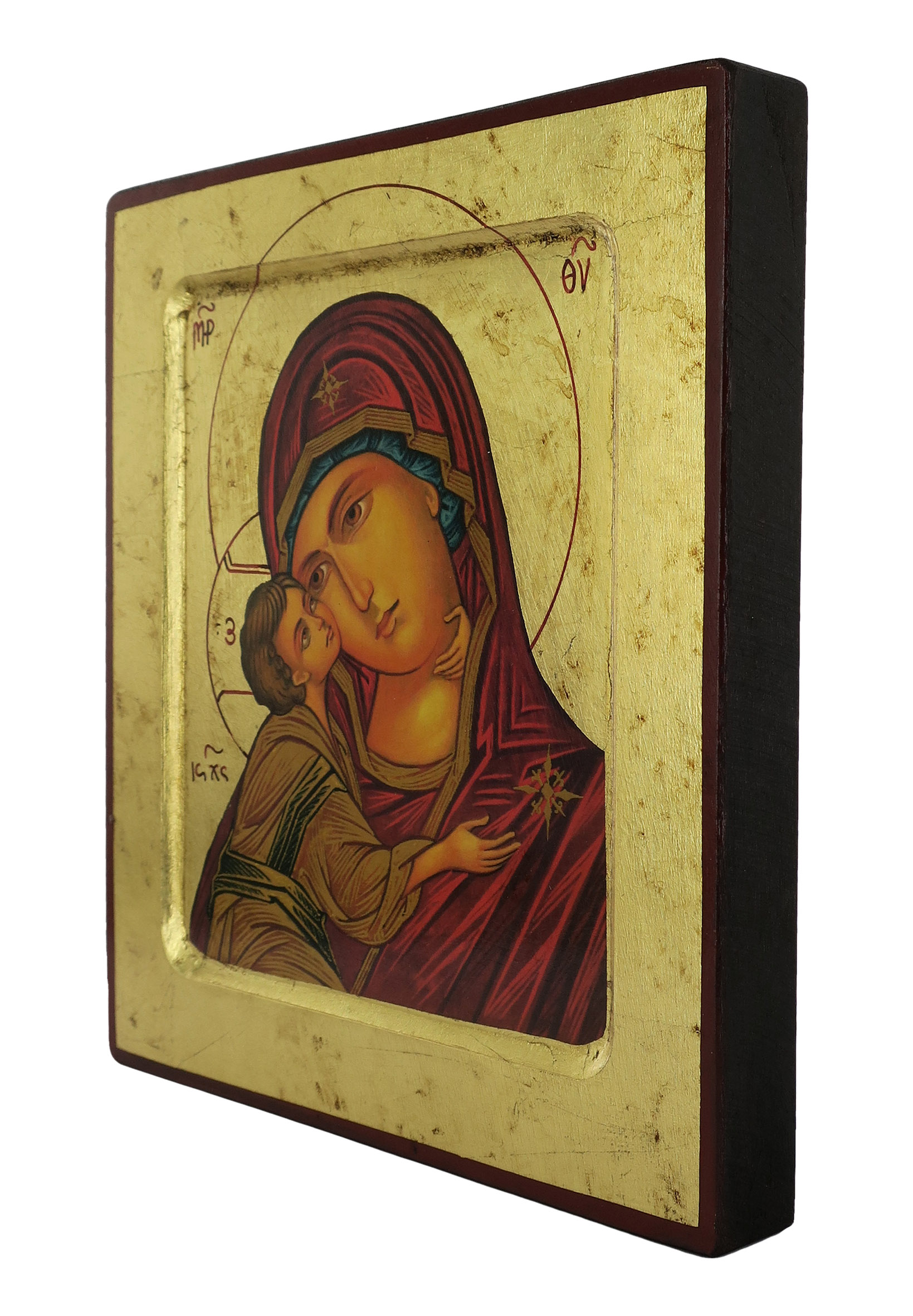 Icona Madonna della Tenerezza, Vergine di Vladimir, Icona in Stile Arte Bizantina, Icona su Legno Rifinita con Aureole, Scritte e Bordure Fatte a Mano, Produzione Greca - 20 x 18 Cm