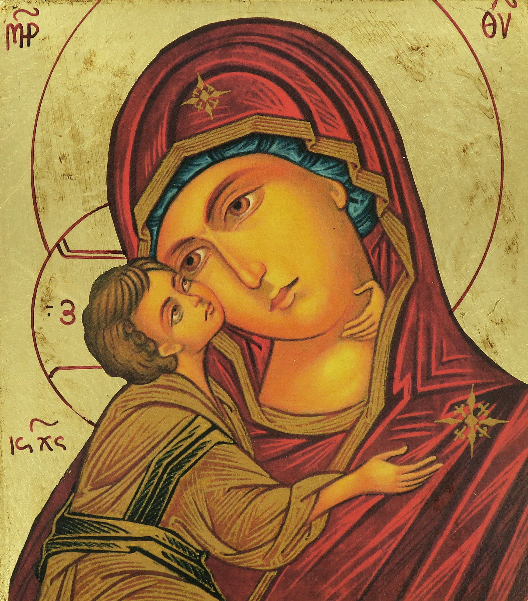 Icona da parete, di forma rettangolare, che raffigura la Vergine della Tenerezza di Vladimir. Si tratta di una copia d'arte bizantina: l'icona originale della Madre di Dio della Tenerezza, a cui questa riproduzione si ispira, fu dipinta a Costantinopoli nel XII secolo ed è conservata a Mosca. Tra le icone ortodosse più venerate al mondo, la Theotókos ("Madre di Dio" in greco) è la figura protettrice della Russia.