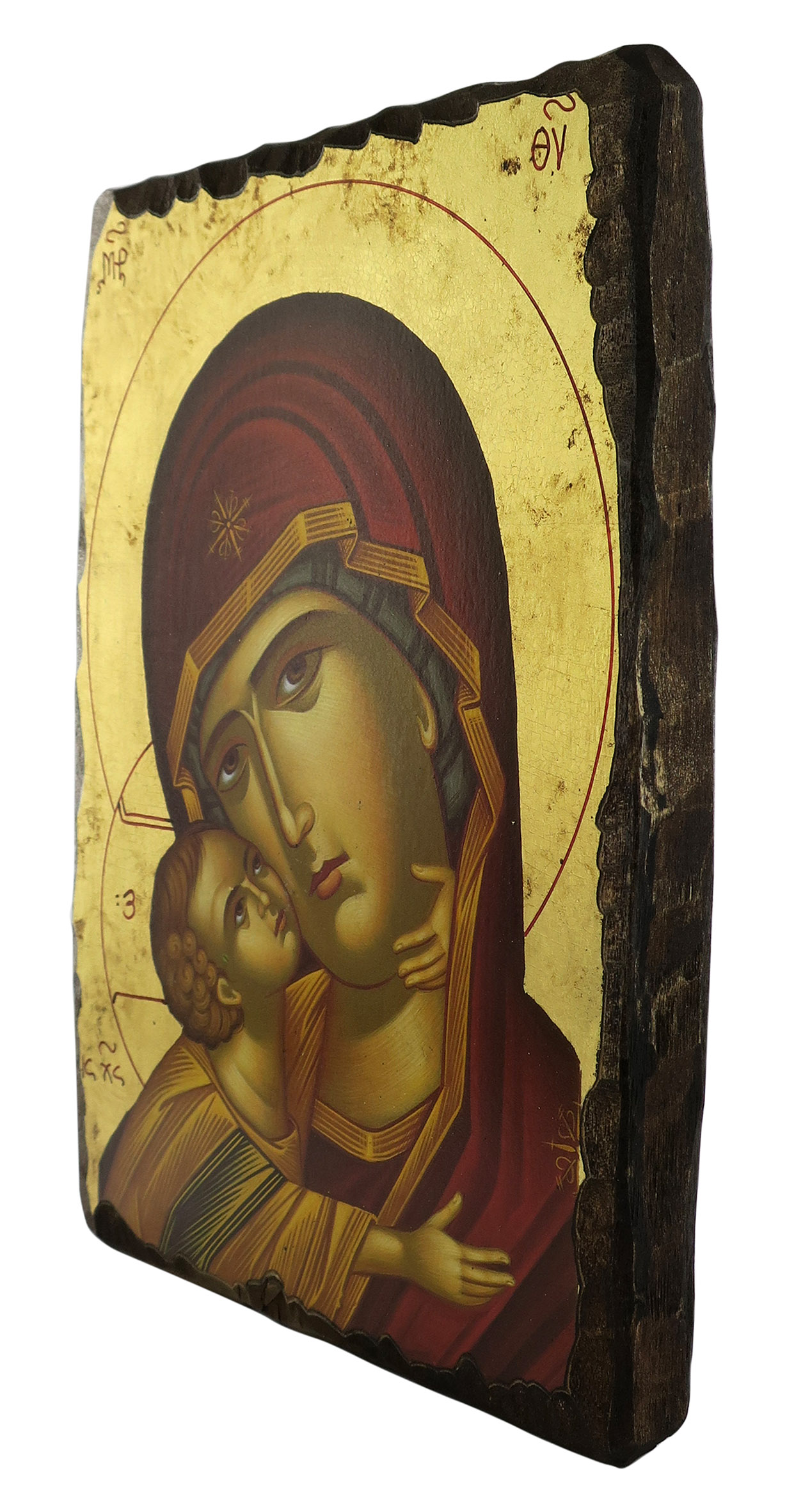 Icona Madonna della Tenerezza, Vergine di Vladimir, Icona in Stile Arte Bizantina, Icona su Legno Rifinita con Aureole, Scritte e Bordure Fatte a Mano, Produzione Greca - 24,5 x 18,5 Cm
