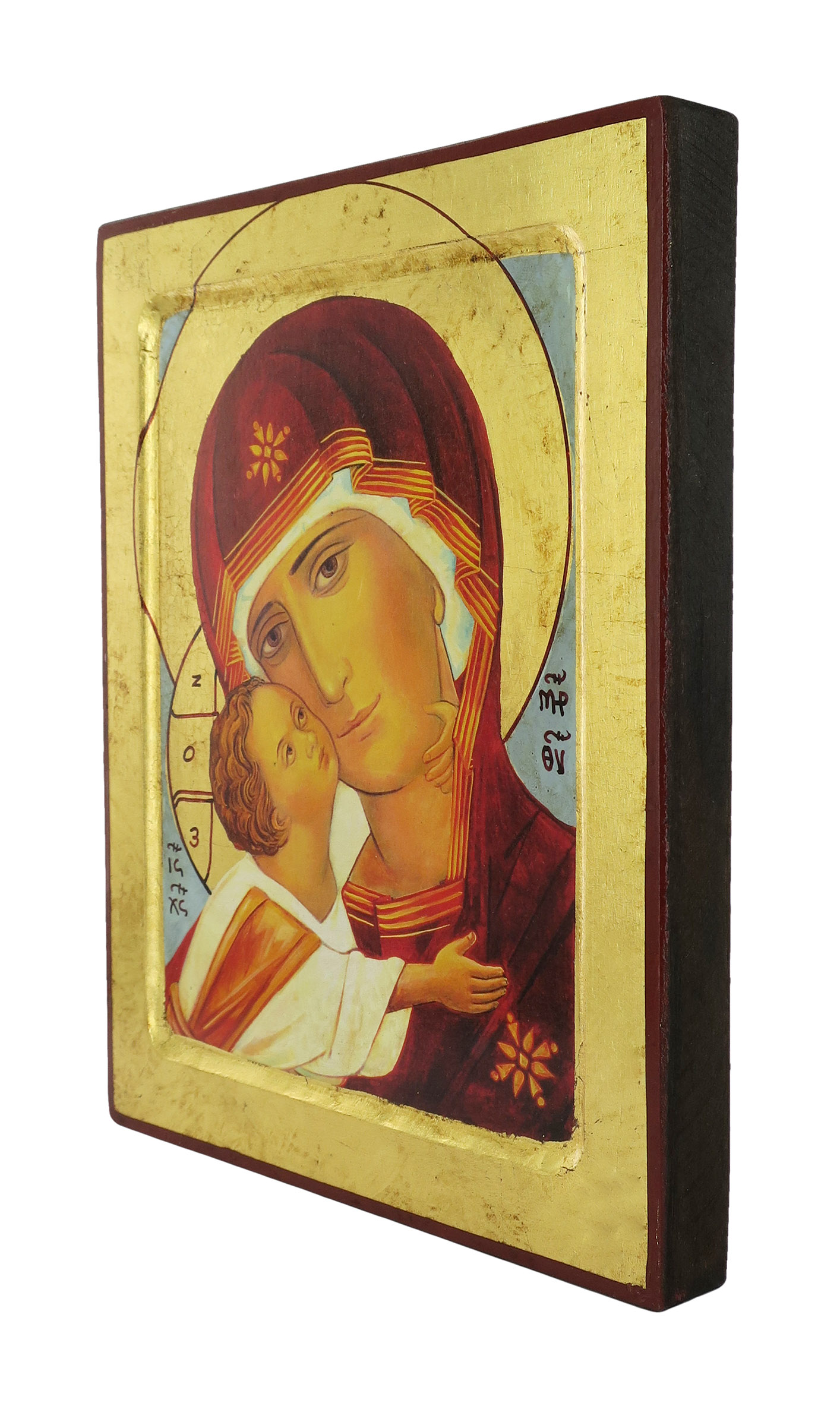Icona Madonna della Tenerezza, Vergine di Vladimir, Icona in Stile Arte Bizantina, Icona su Legno Rifinita con Aureole, Scritte e Bordure Fatte a Mano, Produzione Greca - 24,5 x 20 Cm