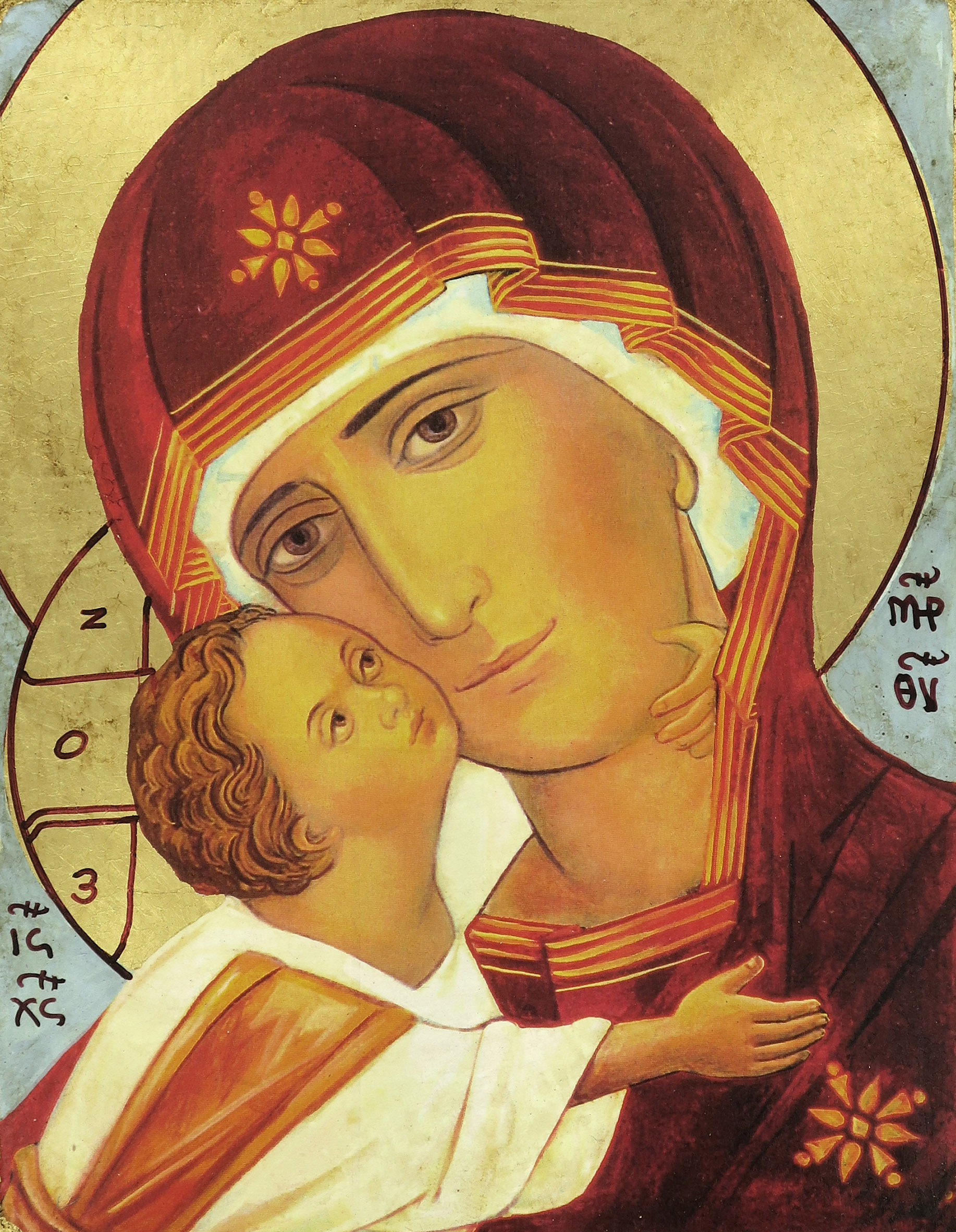 Icona da parete, di forma rettangolare, che raffigura la Vergine della Tenerezza di Vladimir (altrimenti detta "Theotókos di Vladimir"). Si tratta di una copia d'arte bizantina: l'icona originale della Madre di Dio della Tenerezza, a cui questa riproduzione si ispira, fu dipinta a Costantinopoli nel XII secolo ed è conservata a Mosca. Tra le icone ortodosse più venerate al mondo, la Theotókos ("Madre di Dio" in greco) è la figura protettrice della Russia.