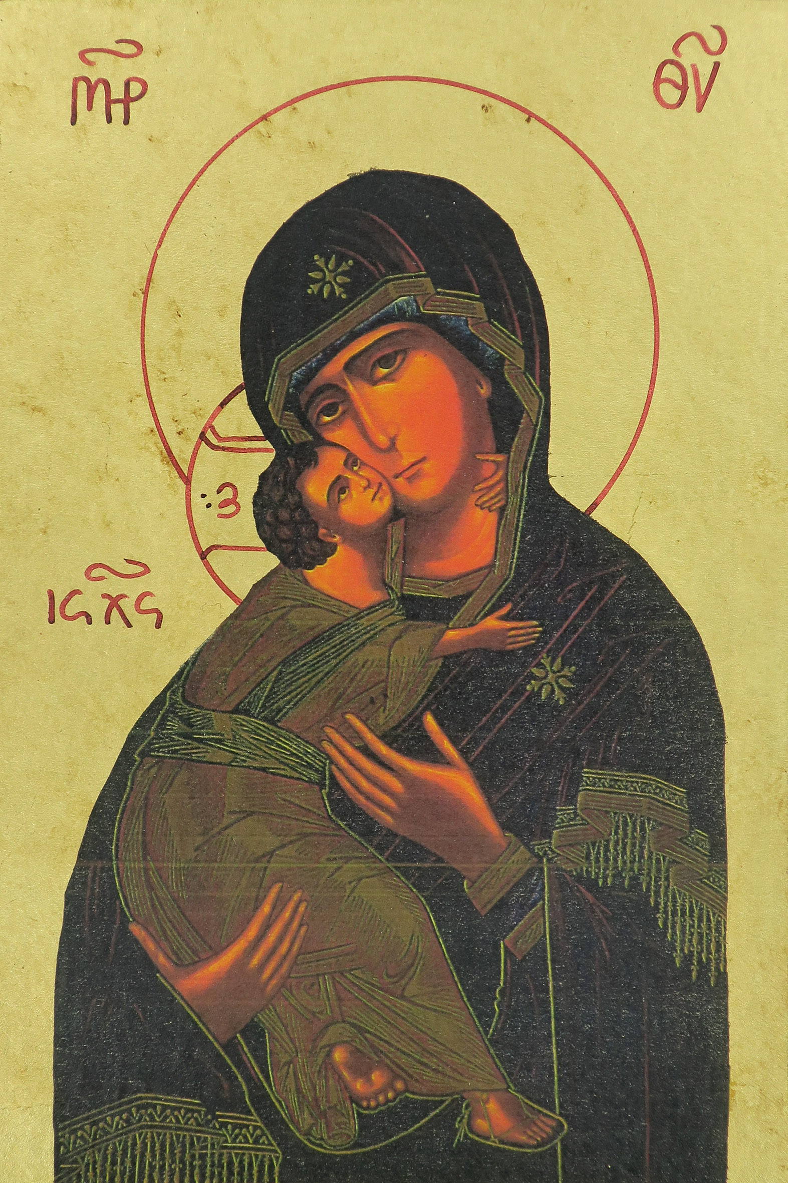 Icona da parete, di forma rettangolare, che raffigura la Vergine della Tenerezza di Vladimir. Si tratta di una copia d'arte bizantina: l'icona originale della Madre di Dio della Tenerezza, a cui questa riproduzione si ispira, fu dipinta a Costantinopoli nel XII secolo ed è conservata a Mosca. Tra le icone ortodosse più venerate al mondo, la Theotókos ("Madre di Dio" in greco) è la figura protettrice della Russia.
