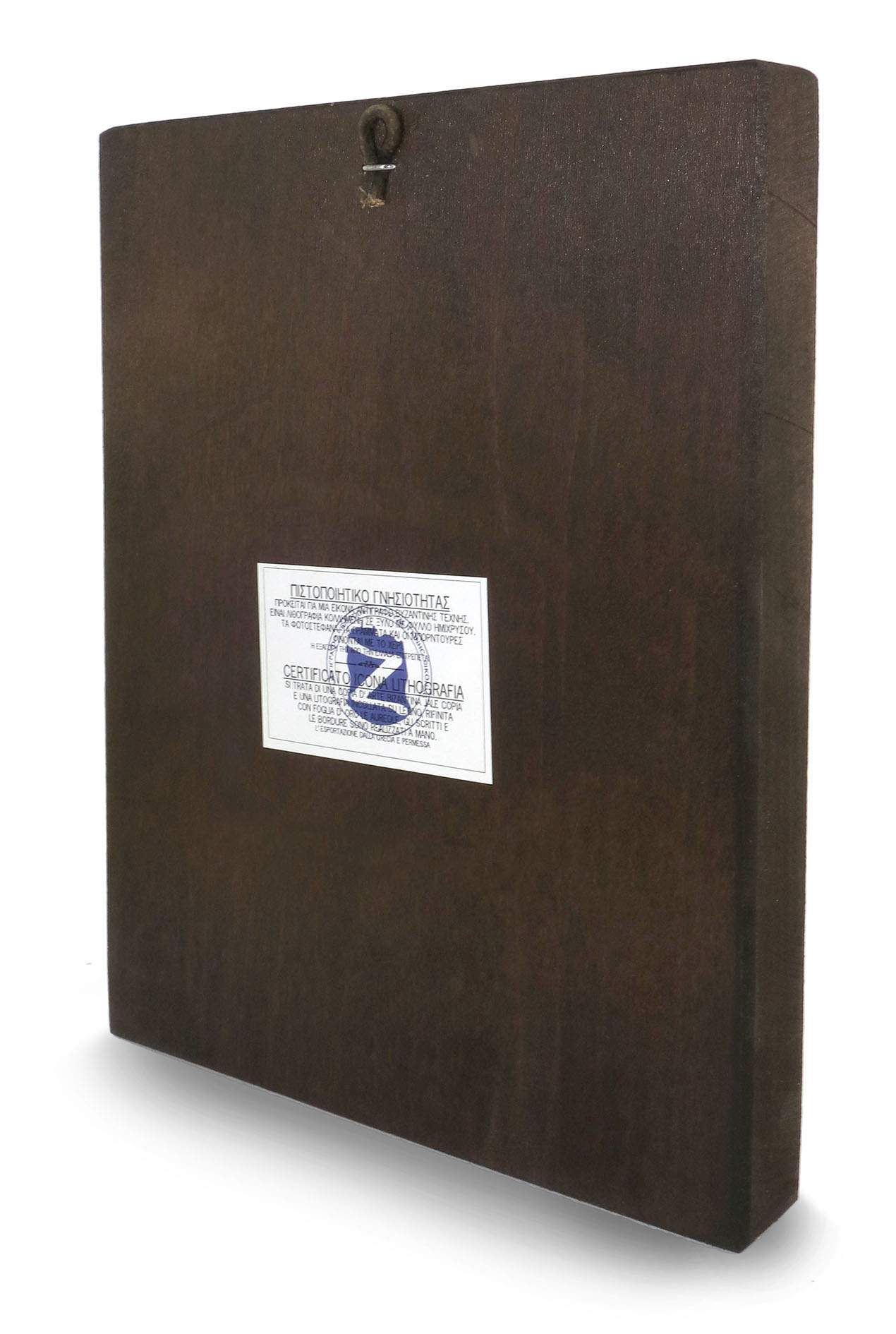Il certificato sul retro attesta le caratteristiche di questa icona, realizzata in Grecia.