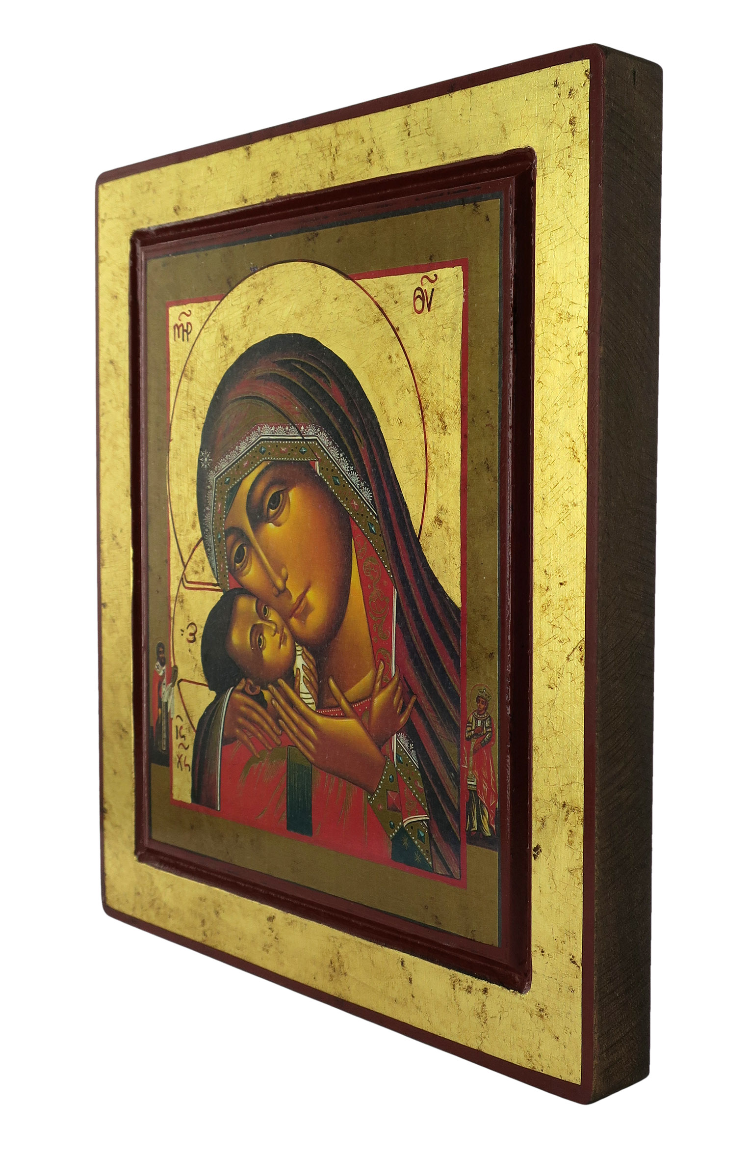 Icona Madonna di Korsun, Icona in Stile Arte Bizantina, Icona su Legno Rifinita con Aureole, Scritte e Bordure Fatte a Mano, Produzione Greca - 25 x 22 Cm