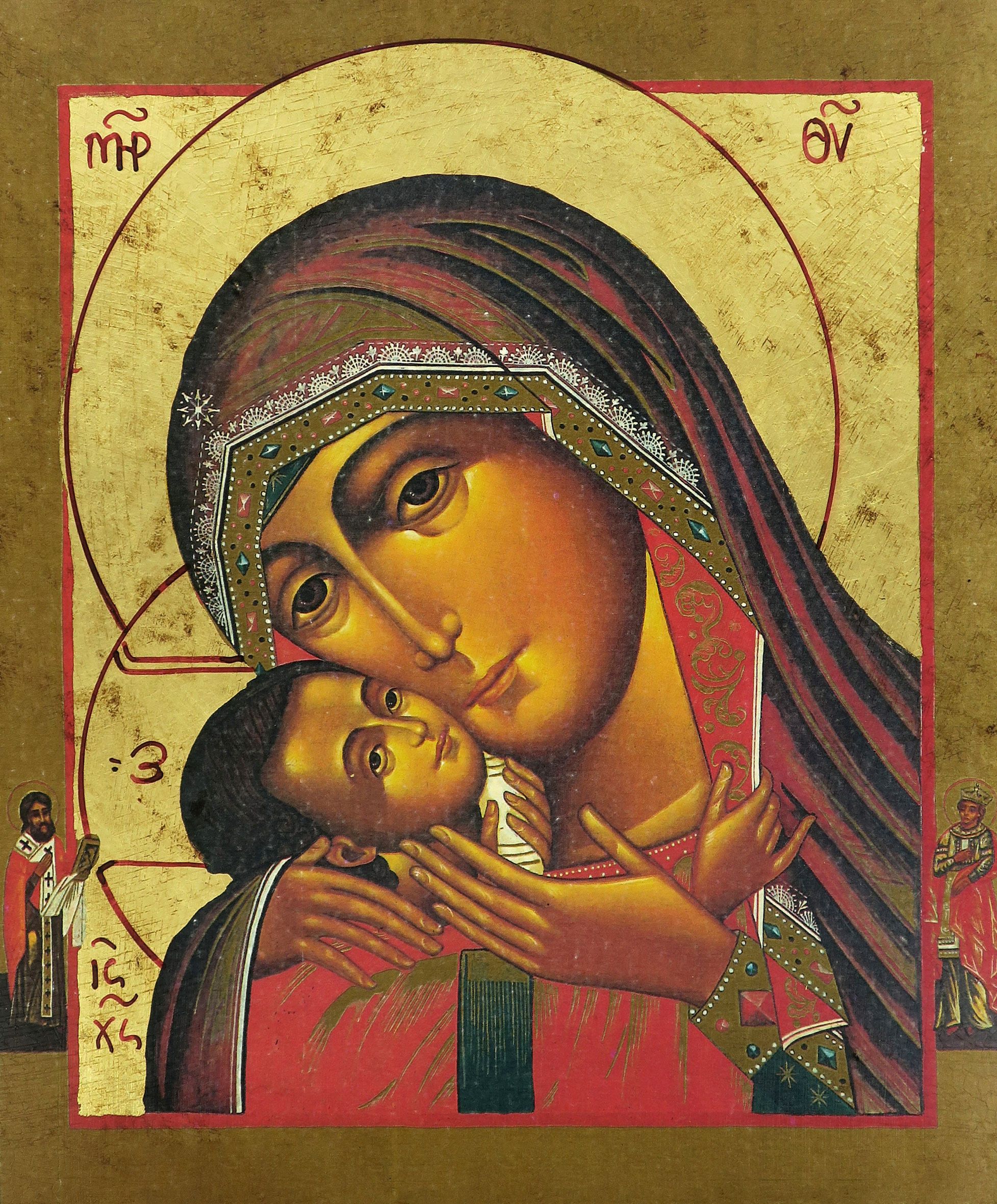 Icona da parete, di forma quasi quadrata, che raffigura la Beata Vergine di Korsun. Si tratta di una copia dell'icona dipinta a mano dall'iconografa Lia Galdiolo di Padova. La Madonna indossa un velo con un orlo ricco di decori e il Bambino poggia la propria guancia al volto della madre. Tale rappresentazione rientra nella tipologia di icone mariane "eleusa", in cui Maria è "Madre di Dio della Tenerezza". La Madonna di Korsun ha una lunga storia: la tavola antica originale prese il nome dalla città di Korsun (antica Chersonneso) situata in Crimea. In questa città, antico emporio bizantino, l'icona fu utilizzata dal principe di Kiev Vladimir nel 988 per benedire il Battesimo della nazione Russia. La particolarità dell'icona è la rappresentazione della Vergine fino alle spalle, stretta contro la guancia del bambino. L'opera originale si dice sia stata dipinta dallo stesso Luca Evangelista.