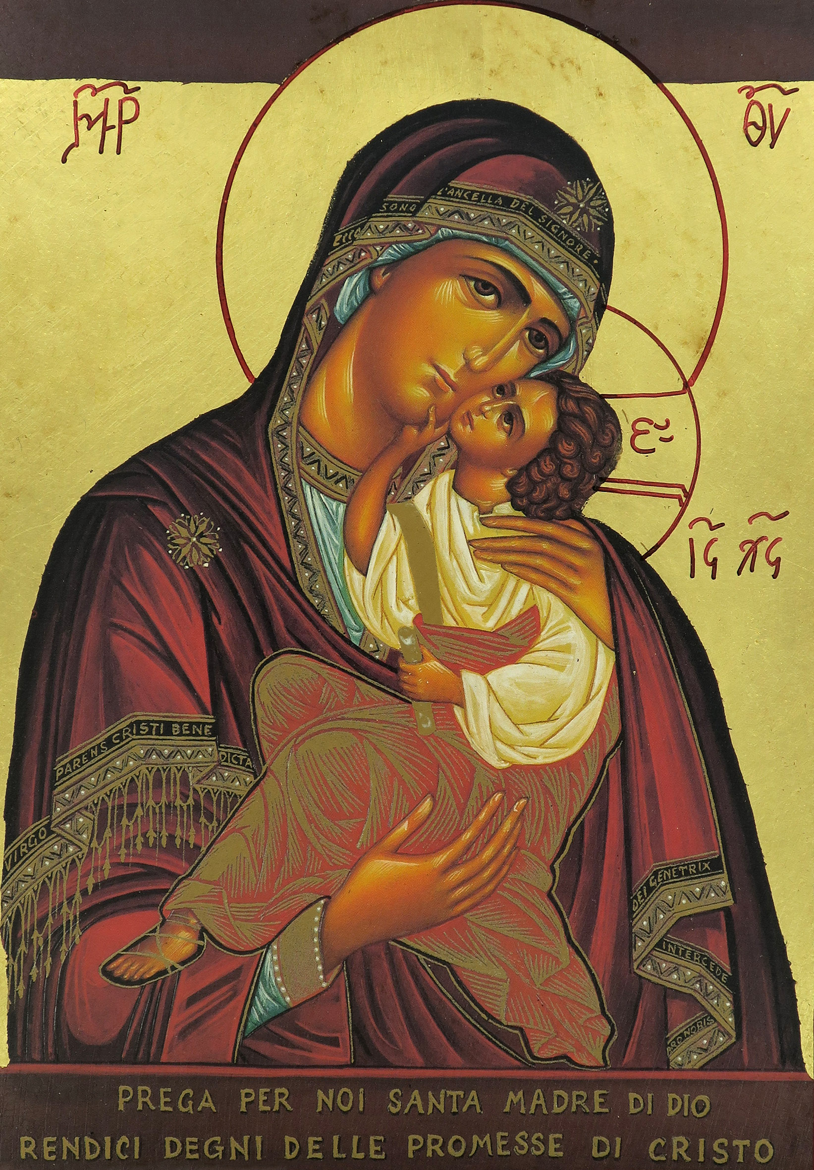 Icona da parete, di forma rettangolare, che raffigura la Madonna di Sofronov. Si tratta di una copia dell'icona dipinta a mano dall'iconografa Lia Galdiolo di Padova. Nella scena, la Vergine ha in braccio il Bambino, raffigurato a figura intera, con colori delle vesti che spiccano rispetto a quelli della madre. Tale rappresentazione rientra nella tipologia di icone mariane "eleusa", in cui Maria è "Madre di Dio della Tenerezza".