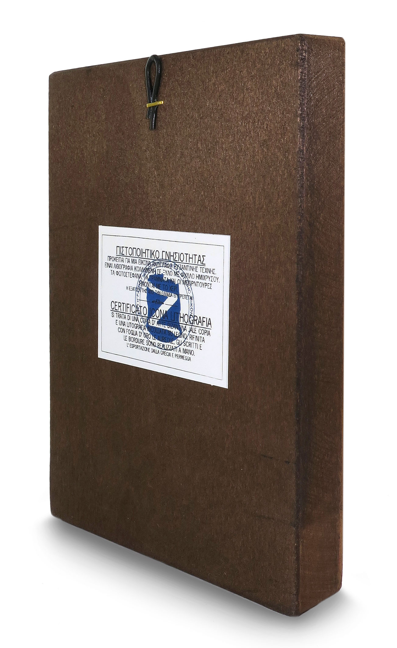 Il certificato sul retro attesta le caratteristiche di questa icona, realizzata in Grecia.