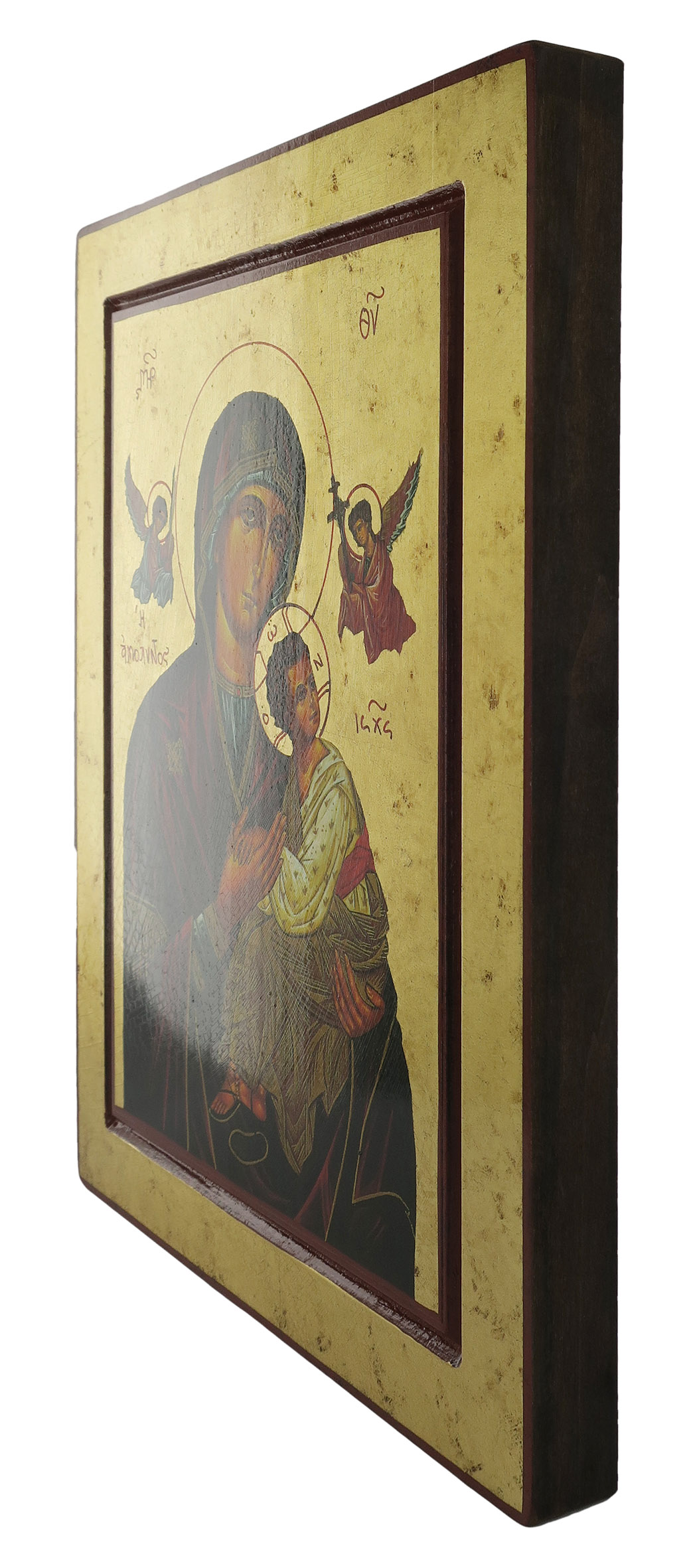 Icona Perpetuo Soccorso (Madonna della Passione), Icona in Stile Arte Bizantina, Icona su Legno Rifinita con Aureole, Scritte e Bordure Fatte a Mano, Produzione Greca - 32,5 x 25,5 Cm