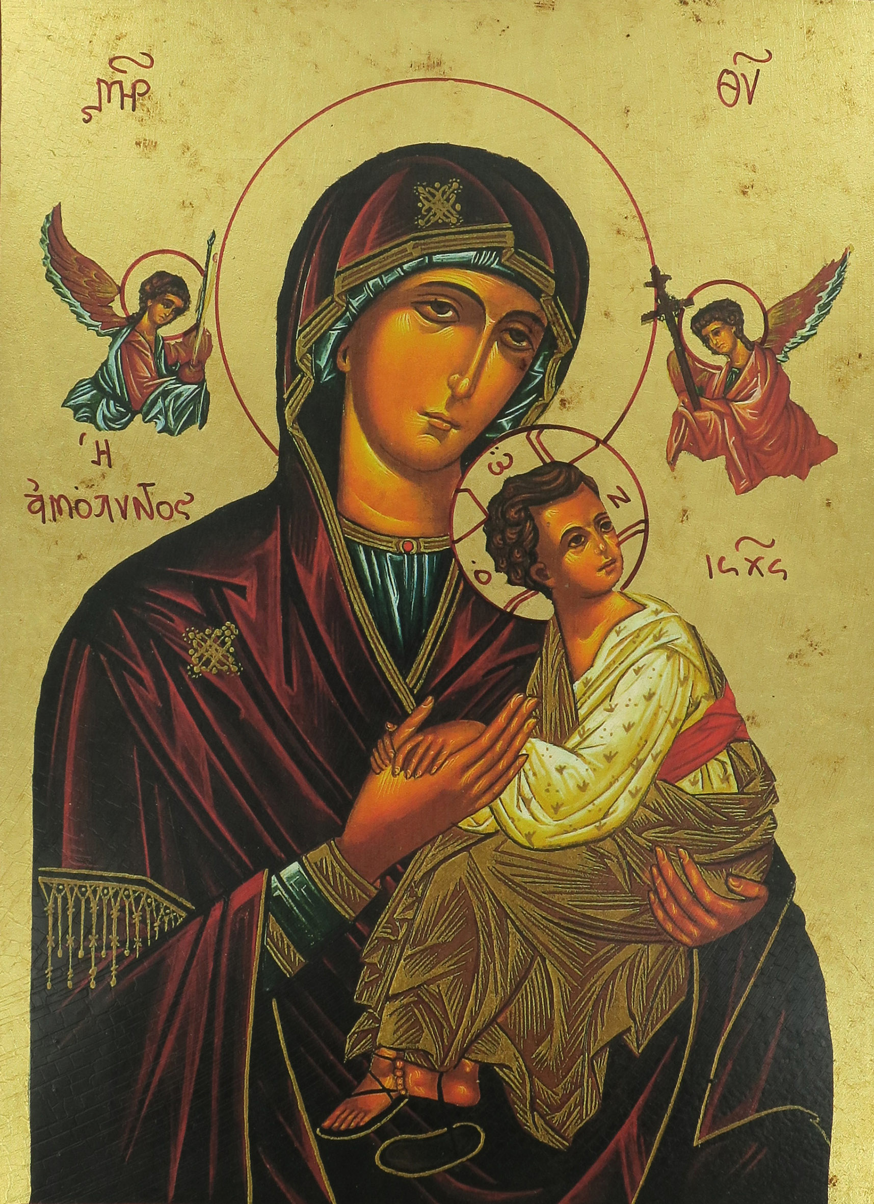 Grande icona da parete, di forma rettangolare, che raffigura la Madre del Perpetuo Soccorso. Si tratta di una copia dell'icona realizzata dall'iconografa Lia Galdiolo, a sua volta ispiratasi all'opera originale della Madonna del Perpetuo Soccorso, forse dell'iconografo cretese Andrea Rizo da Candia. Rientra nel gruppo di rappresentazioni mariane "Madre di Dio della Passione" (Amolyntos).