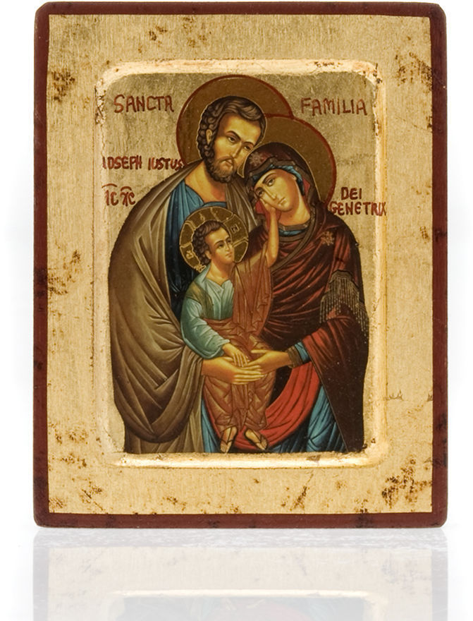 Icona da parete che raffigura la Sacra Famiglia. Si tratta di una copia d'arte bizantina: l'immagine è una fine litografia incollata su legno e rifinita con foglia d'oro, mentre le aureole, le scritte e i bordi sono realizzati a mano. il bordo in rilievo, smussato, fa da cornice alla rappresentazione. Il gancio sul retro consente di appendere l'icona alla parete.