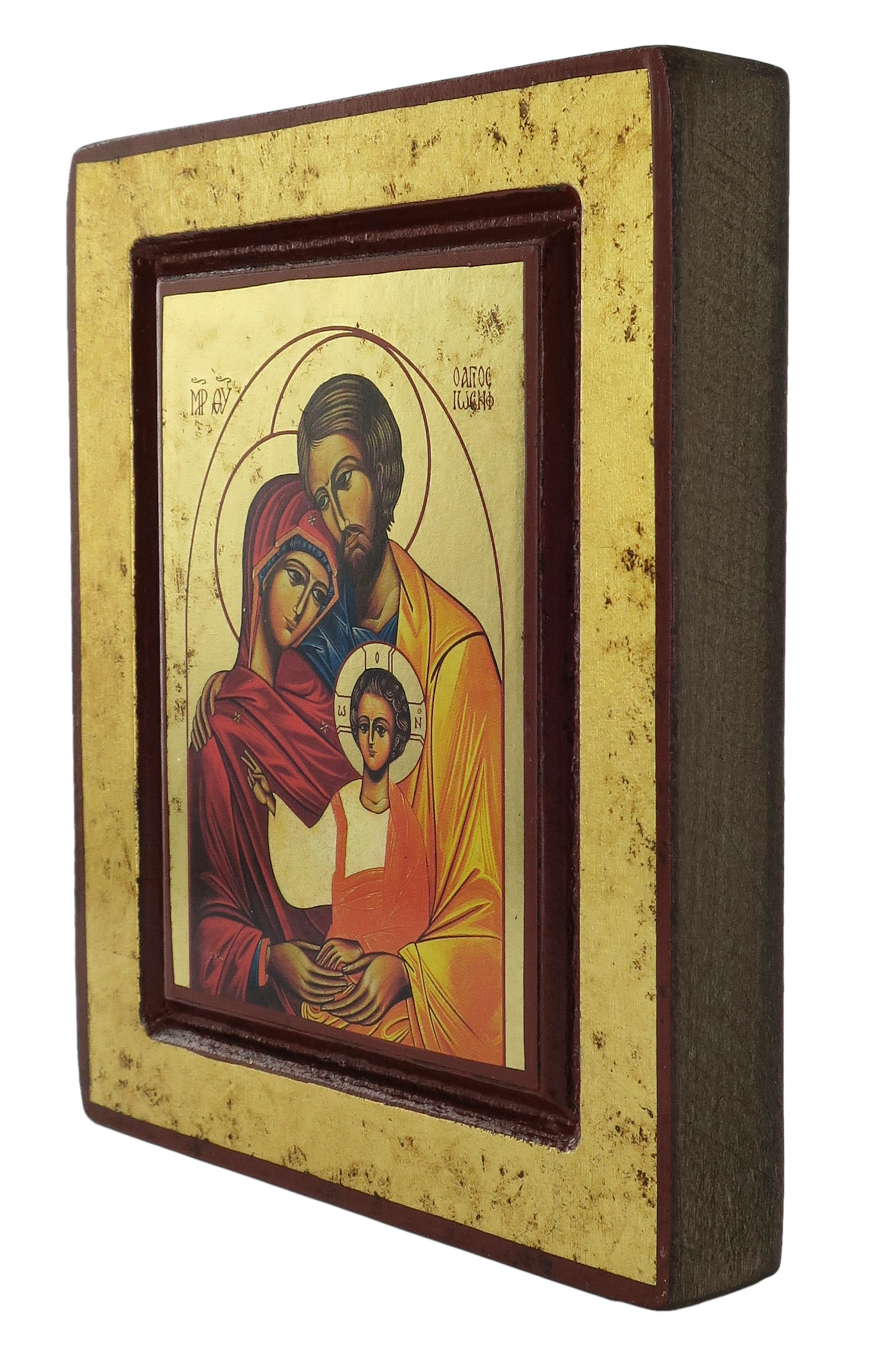 Icona Sacra Famiglia, Icona in Stile Arte Bizantina, Icona su Legno Rifinita con Aureole, Scritte e Bordure Fatte a Mano, Produzione Greca - 14 x 11,5 Cm