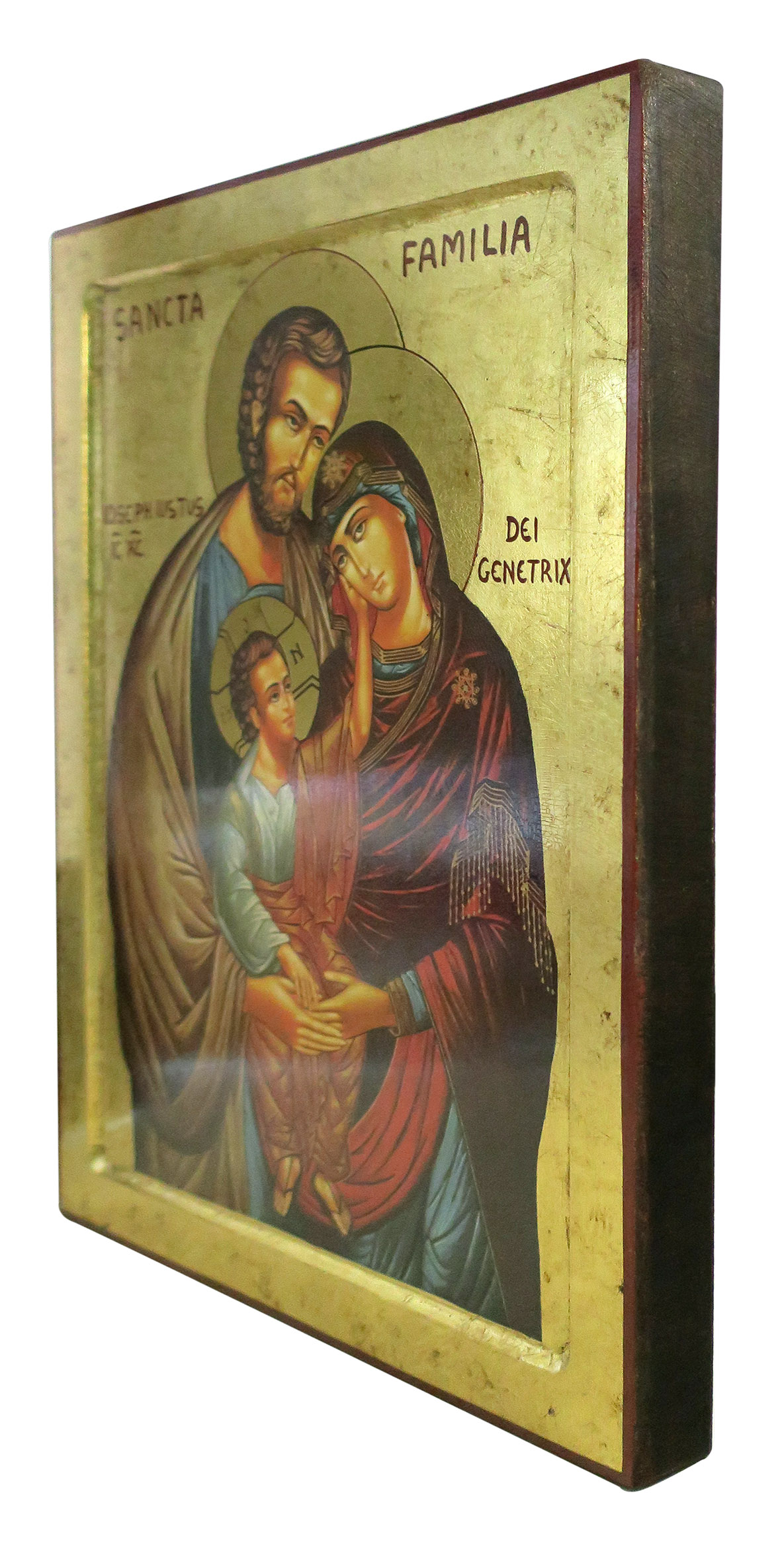Grande icona da parete che raffigura la Sacra Famiglia. Si tratta di una copia d'arte bizantina: l'immagine di questo quadro è una fine litografia incollata su legno e rifinita con foglia d'oro, mentre le aureole, le scritte e i bordi sono realizzati a mano. il bordo in rilievo, smussato, fa da cornice alla rappresentazione. Il gancio sul retro consente di appendere la grande icona alla parete.